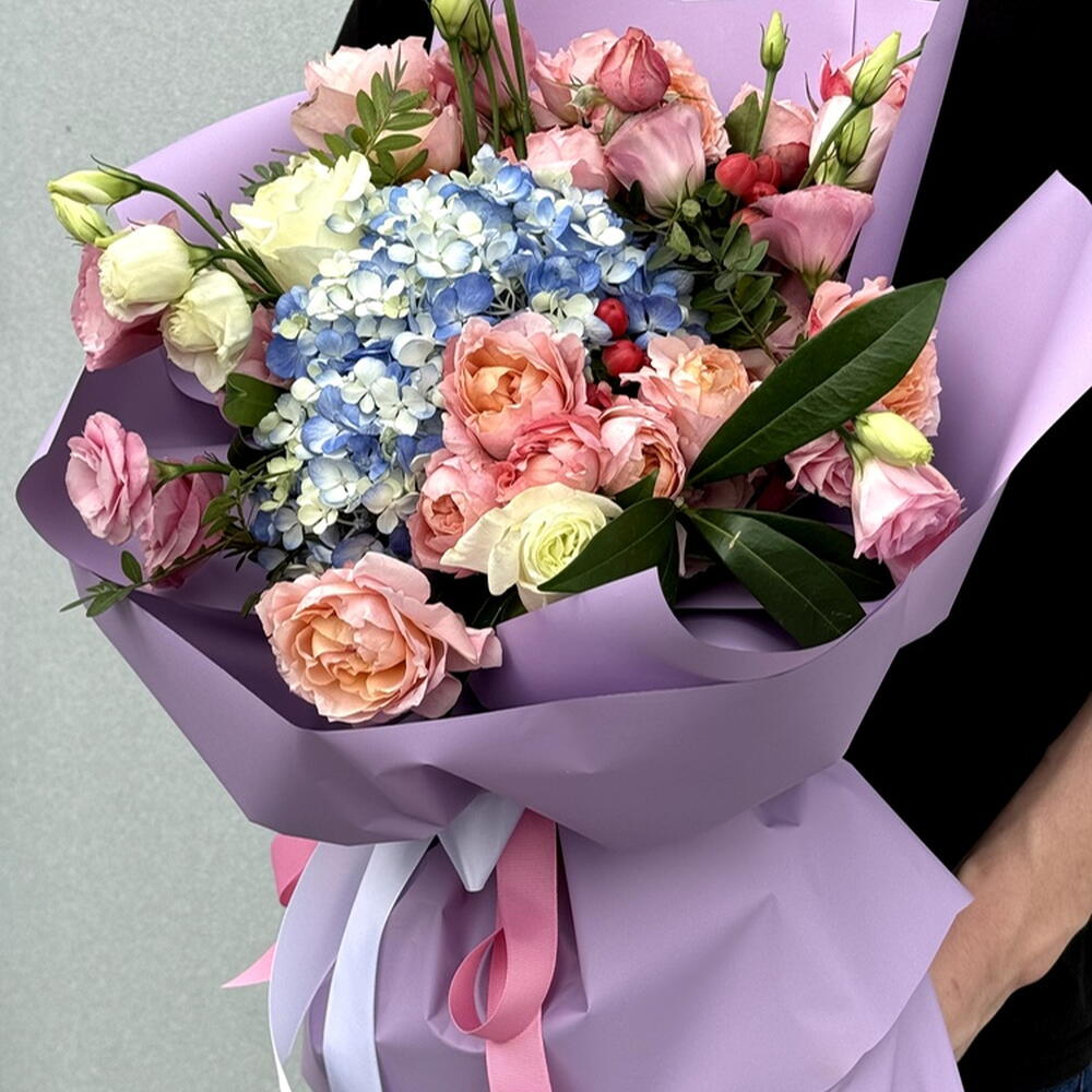 Composition: Hydrangea - 1, Skimmia - 1, Pistacia - 2, Spray Rose Julieta peach - 5, Rose white - 3, Lisianthus - 5, Wrapping Paper - 1, RIBBON - 1 Sizes: WIDTH - 40CM; HEIGHT - 55CM; LENGTH - 55CM; (including packaging) Size: 40 x 55 x 55 cm