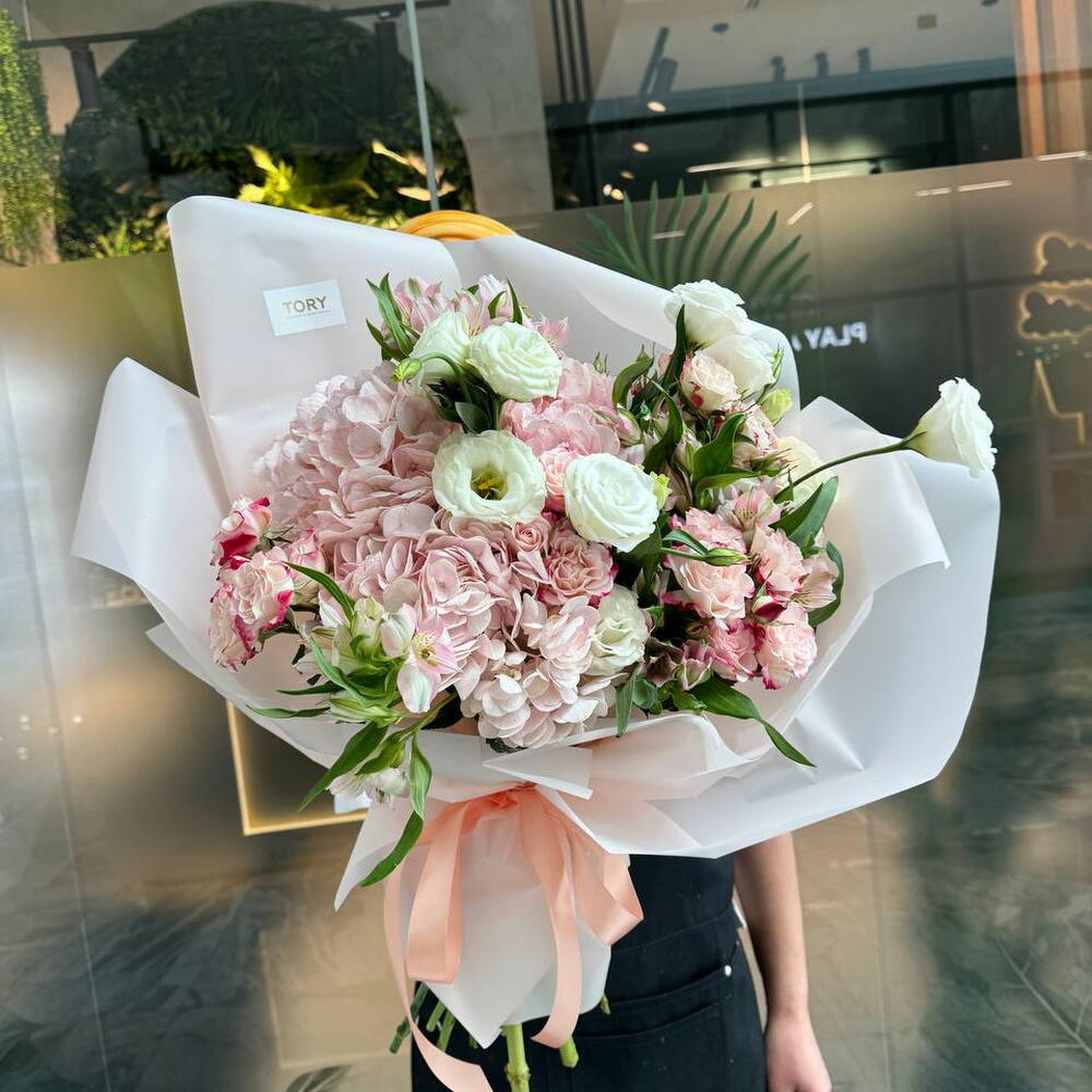 Composition: Hydrangea - 3, Alstroemeria - 5, Spray Rose Reflex pink double colour - 5, Lisianthus - 5, Flower Wrapping Paper - 1 Sizes: WIDTH - 55CM; HEIGHT - 60CM; LENGTH - 60CM; (including packaging) Size: 55 x 60 x 60 cm