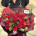 Composition: Rose red - 15, Vanda - 5, Skimmia - 5, Eucalyptus - 3, Rose spray Red Piano - 3, Flower Wrapping Paper - 1 Sizes: WIDTH - 45CM; HEIGHT - 60CM; LENGTH - 60CM; (including packaging) Размер: 45 x 60 x 60 см
