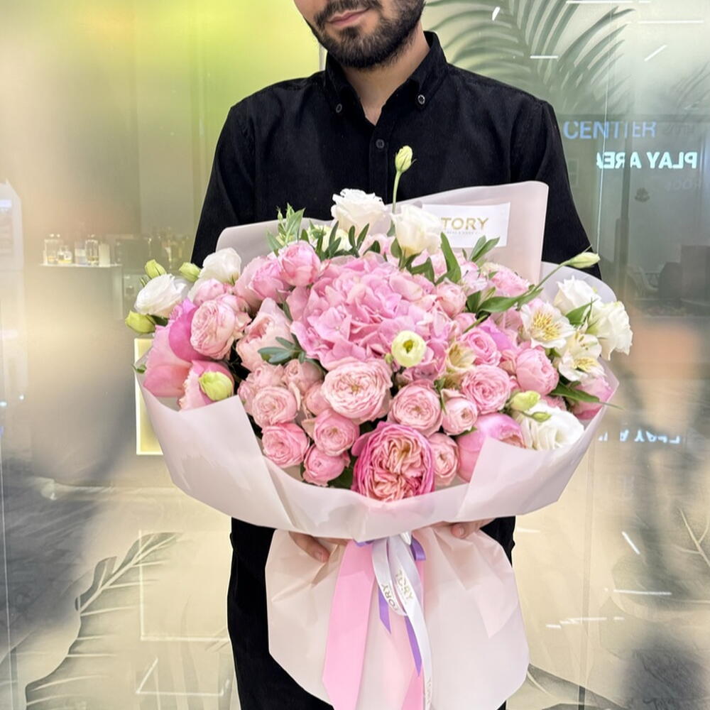 Composition: Hydrangea mix - 3, Rose David Austin - 12, Alstroemeria - 5, Rose spray Mansfield Park - 15, Pistacia - 2, Lisianthus - 5, Flower Wrapping Paper - 1 Sizes: WIDTH - 45CM; HEIGHT - 60CM; LENGTH - 60CM; (including packaging) Size: 45 x 60 x 60 cm