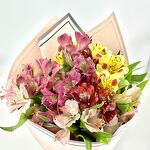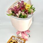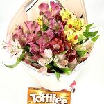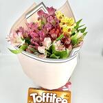 Composition: Alstroemeria - 11, RIBBON - 1, Wrapping Paper - 1, chocolateToffifee 125g - 1 Sizes: WIDTH - 25CM; HEIGHT - 45CM; LENGTH - 45CM; (including packaging) Size: 25 x 45 x 45 cm