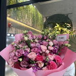 Composition: Mattiola - 8, Spray Rose Julieta peach - 8, Lisianthus - 11, Dianthus spray - 5, Dianthus - 4 Sizes: WIDTH - 55CM; HEIGHT - 60CM; LENGTH - 60CM; (including packaging) Size: 55 x 60 x 60 cm