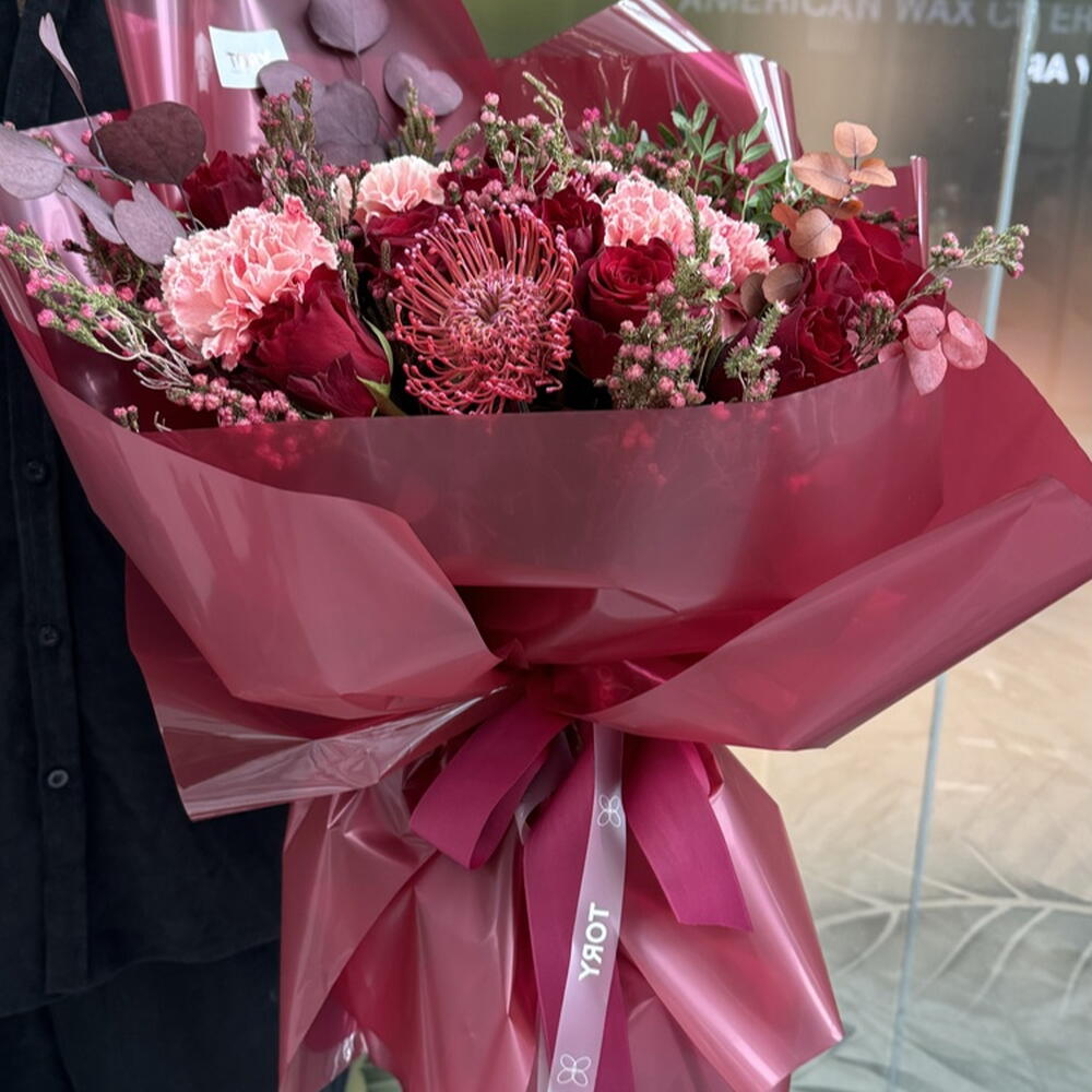 Composition: Leucospermum - 4, Dianthus - 5, Rose red - 15, Pistacia - 2, Eucalyptus - 3, Chamelacium - 4, Flower Wrapping Paper - 1 Sizes: WIDTH - 35CM; HEIGHT - 60CM; LENGTH - 60CM; (including packaging) Size: 35 x 60 x 60 cm