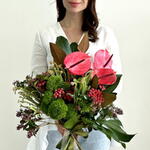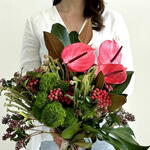 Composition: Magnolia - 2, Anthurium - 3, Monstera - 1, Skimmia - 3, Dianthus Green Trick - 6, Brunia - 5, blad chamaerops - 4, ribbon - 1 Sizes: WIDTH - 35CM; HEIGHT - 50CM; LENGTH - 50CM; (including packaging) Size: 35 x 50 x 50 cm