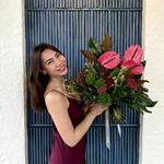 Brunia - 5 pcs Ribbon - 1 pcs Anthurium - 3 pcs monstera - 1 pcs skimmia - 3 pcs dianthus green trick - 6 pcs magnolia - 2 pcs Chamaerops leaf - 4 pcs