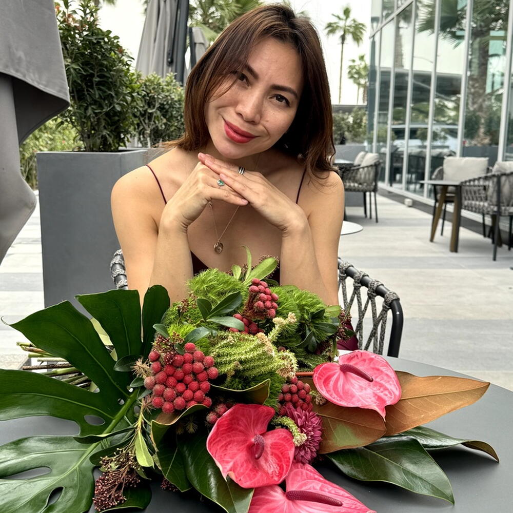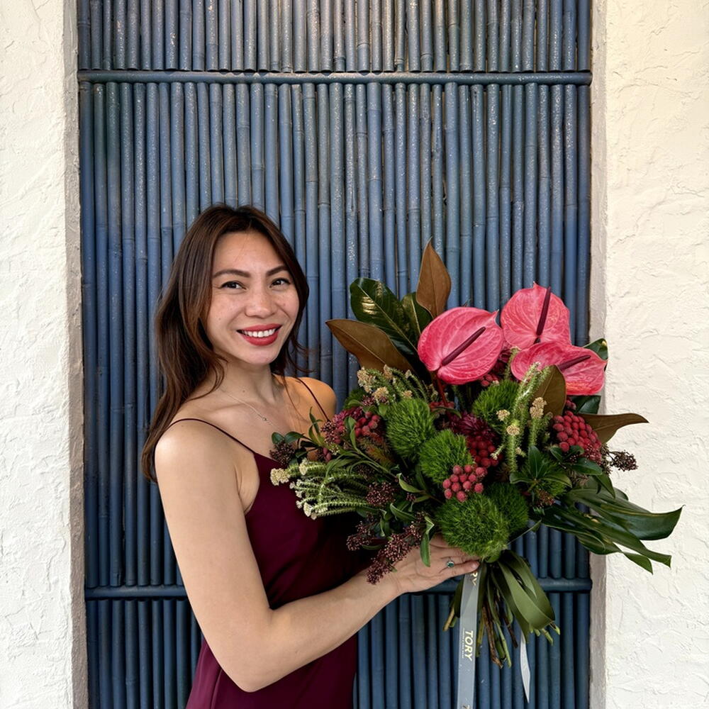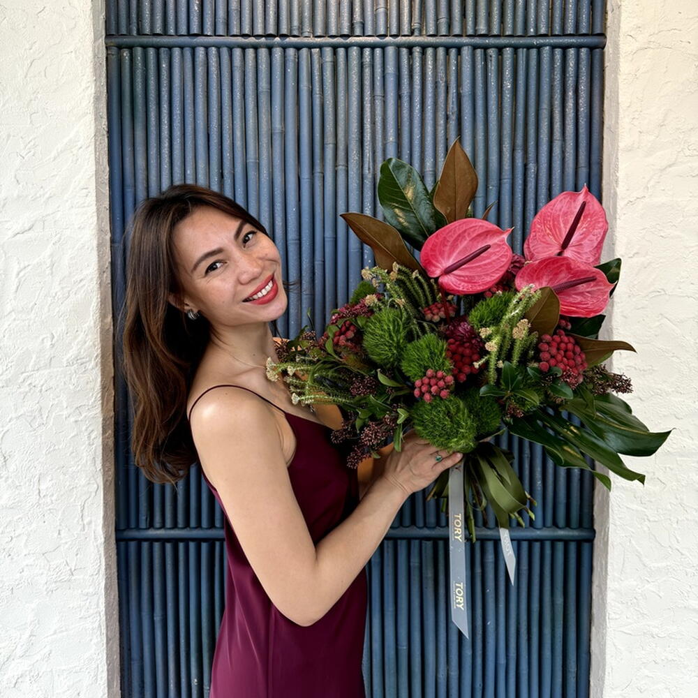 Brunia - 5 pcs Ribbon - 1 pcs Anthurium - 3 pcs monstera - 1 pcs skimmia - 3 pcs dianthus green trick - 6 pcs magnolia - 2 pcs Chamaerops leaf - 4 pcs
