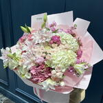 Composition: Hydrangea - 7, Lily Double Oriental - 4, Rose Peach - 7, Rose spray Bombastic - 8, Mattiola - 4, Freesia - 3, Peony import pink - 5 Sizes: WIDTH - 50CM; HEIGHT - 60CM; LENGTH - 60CM; (including packaging) Size: 50 x 60 x 60 cm