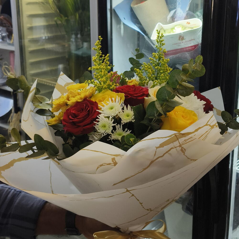 Red rose - 4 pcs White rose - 4 pcs Yellow rose - 4 pcs eucalyptus leaves - 2 pcs chysanthemums - 4 pcs