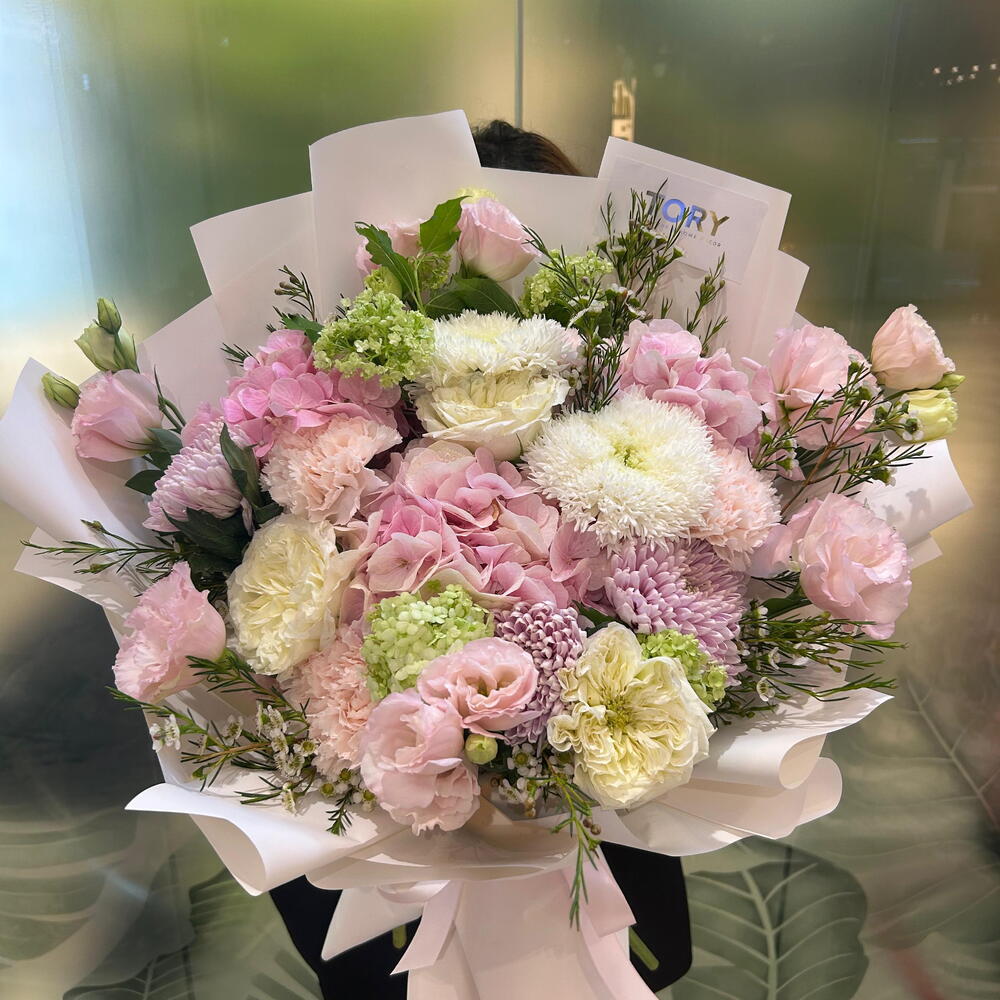 Hydrangea - 3 pcs Chrysanthemum - 6 pcs Viburnum - 2 pcs Lisianthus - 3 pcs dianthus - 4 pcs chamelacium - 3 pcs rose candy expression - 3 pcs
