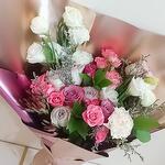 pink spray rose - 3 pcs light purple rose - 4 pcs lisianthus (eustoma) - 2 pcs white carnation - 2 pcs resus - 3 pcs double shade purple rose - 3 pcs