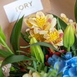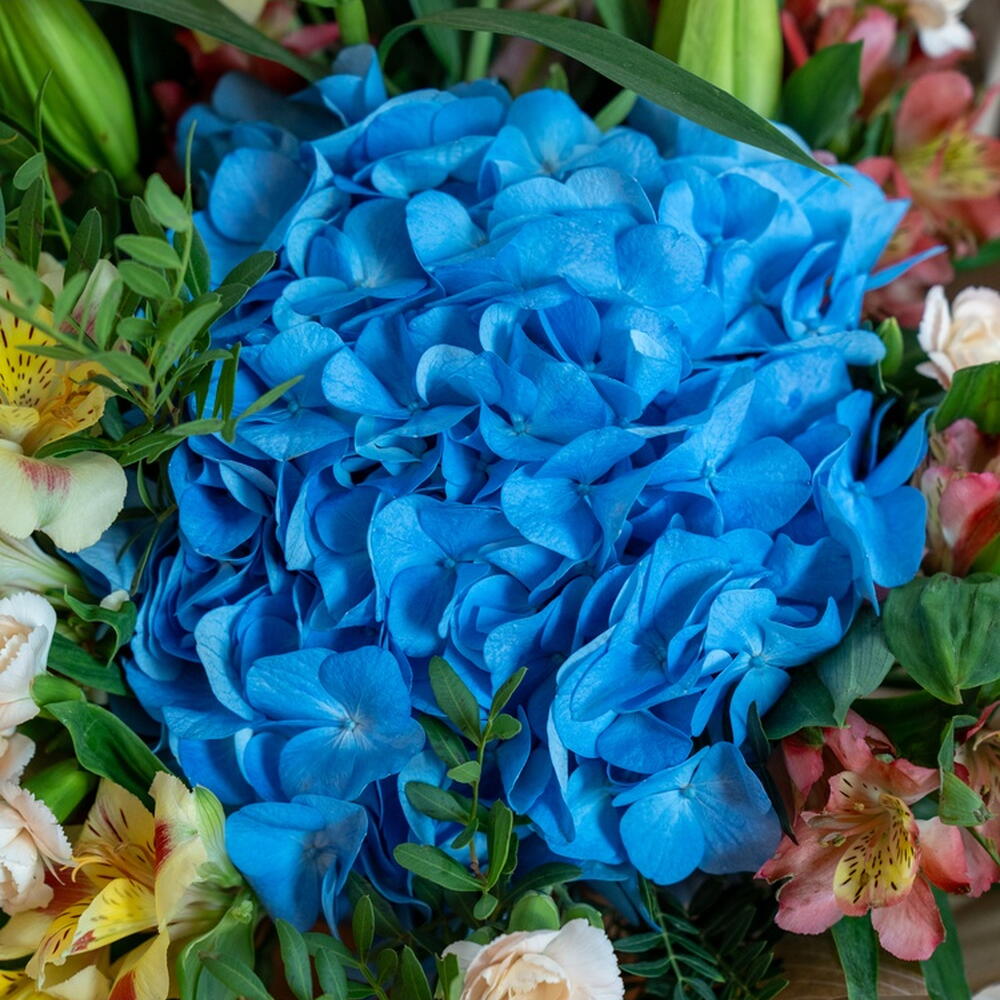Composition: Hydrangea - 1, Alstroemeria - 5, Dianthus spray - 5, Lily - 3, Pistacia - 3, Wrapping Paper - 1, RIBBON - 1 Sizes: WIDTH - 35CM; HEIGHT - 50CM; LENGTH - 50CM; (including packaging) Размер: 35 x 50 x 50 см