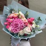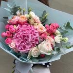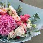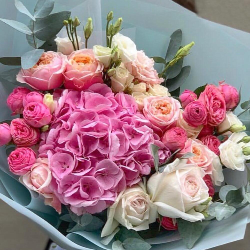 Drift away on a cloud of pastel romance with the Hydrangea Rose Reverie bouquet. At its heart blooms a generous, soft-pink hydrangea, surrounded by delicate spray roses in shades of blush and coral. Creamy ivory lisianthus peeks through silver-dollar eucalyptus, adding graceful movement and a whisper of green. Wrapped in airy, pale-aqua paper and finished with satin ribbon, this arrangement is a poetic celebration of spring’s gentlest hues—ideal for birthdays, anniversaries, or simply to brighten someone’s day with a touch of floral daydream.