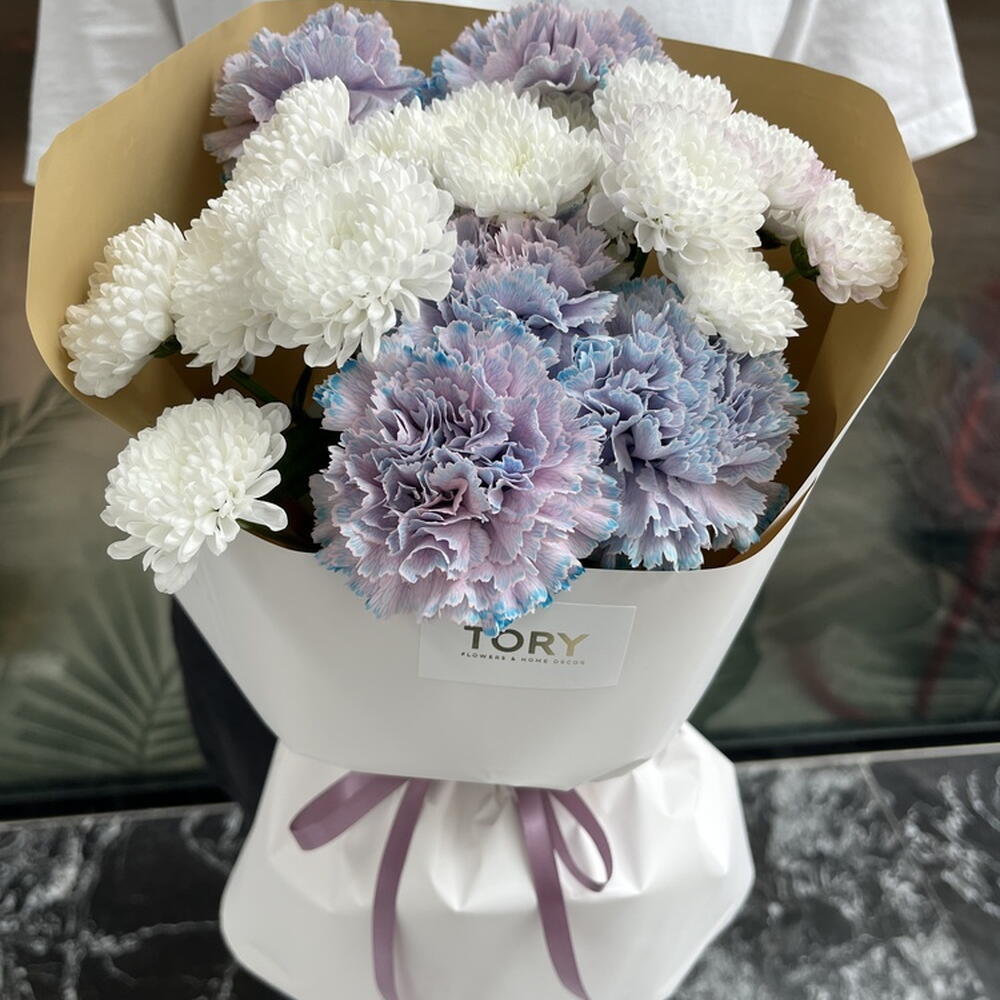 Composition: Chrysanthemum spray - 3, Dianthus - 5 Sizes: WIDTH - 30CM; HEIGHT - 50CM; LENGTH - 50CM; (including packaging) Size: 30 x 50 x 50 cm