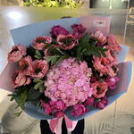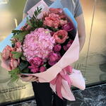 Composition: Hydrangea - 2, Pistacia - 4, Rose spray Rich Babels - 3, Rose Mandarin Expression - 18, Flower Wrapping Paper - 1 Sizes: WIDTH - 55CM; HEIGHT - 65CM; LENGTH - 65CM; (including packaging) Size: 55 x 65 x 65 cm