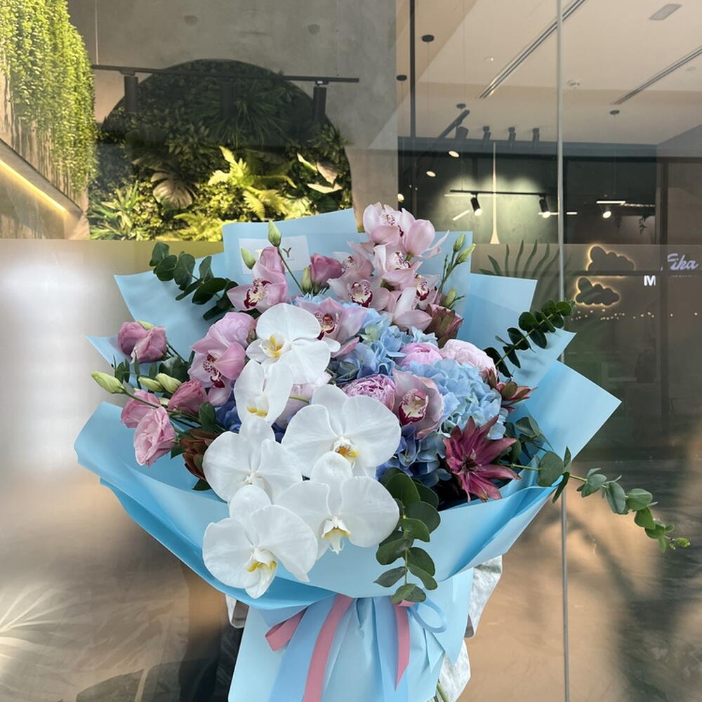 Composition: Hydrangea - 3, Cymbidium - 6, Cymbidium mini - 12, Peony import pink - 5, Eucalyptus - 5, Leucadendron - 5, Lisianthus - 6 Sizes: WIDTH - 55CM; HEIGHT - 65CM; LENGTH - 65CM; (including packaging) Size: 55 x 65 x 65 cm