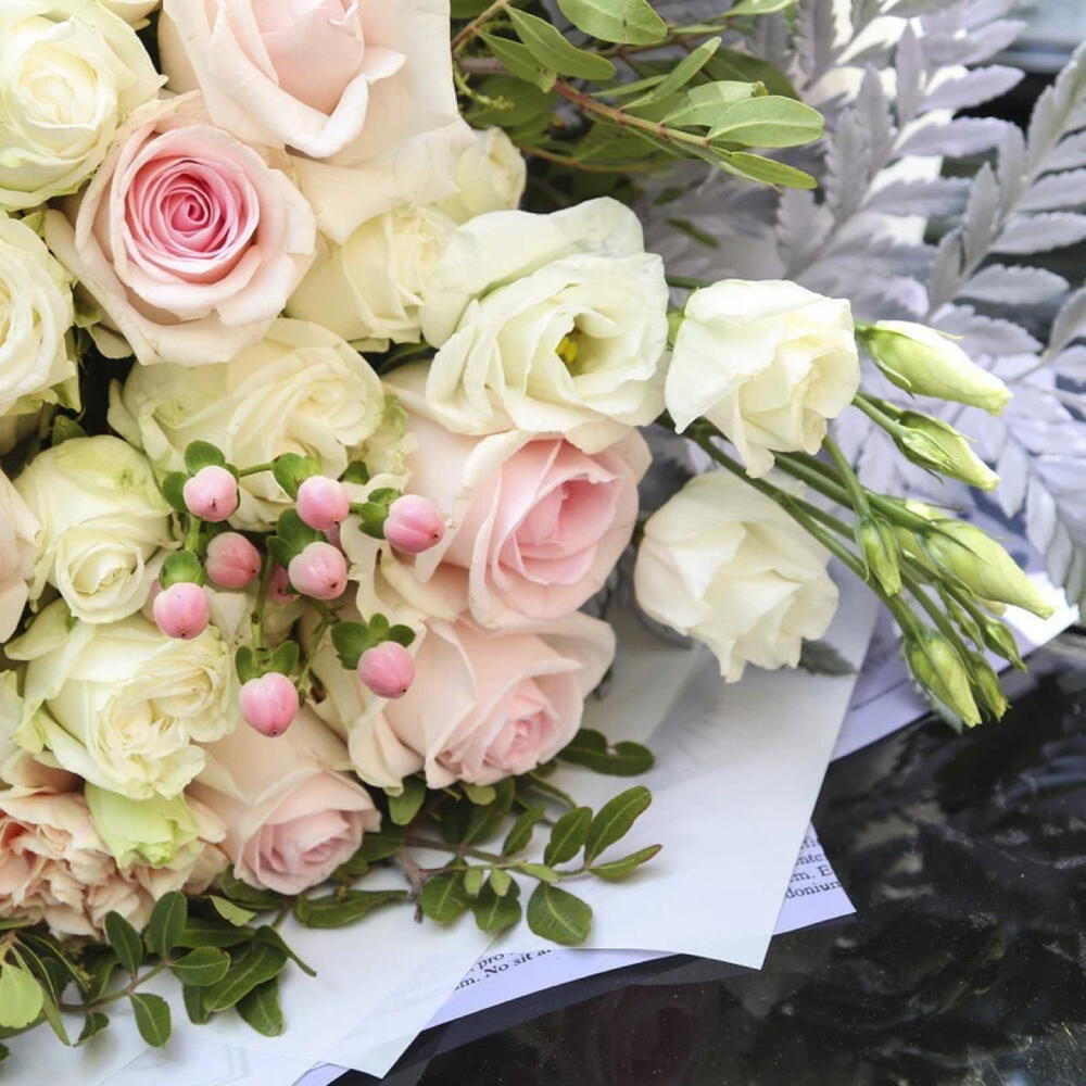 A mixed flowers bouquet with white news paper design wrapping and white ribbon