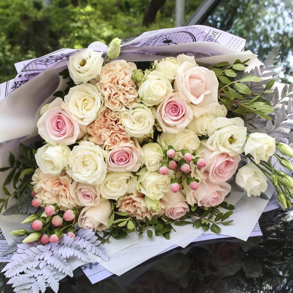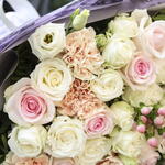 White rose - 10 pcs Pistachio - 5 pcs carnation - 4 pcs white eustoma - 2 pcs pink rose stems - 7 pcs pink hyprecium - 2 pcs