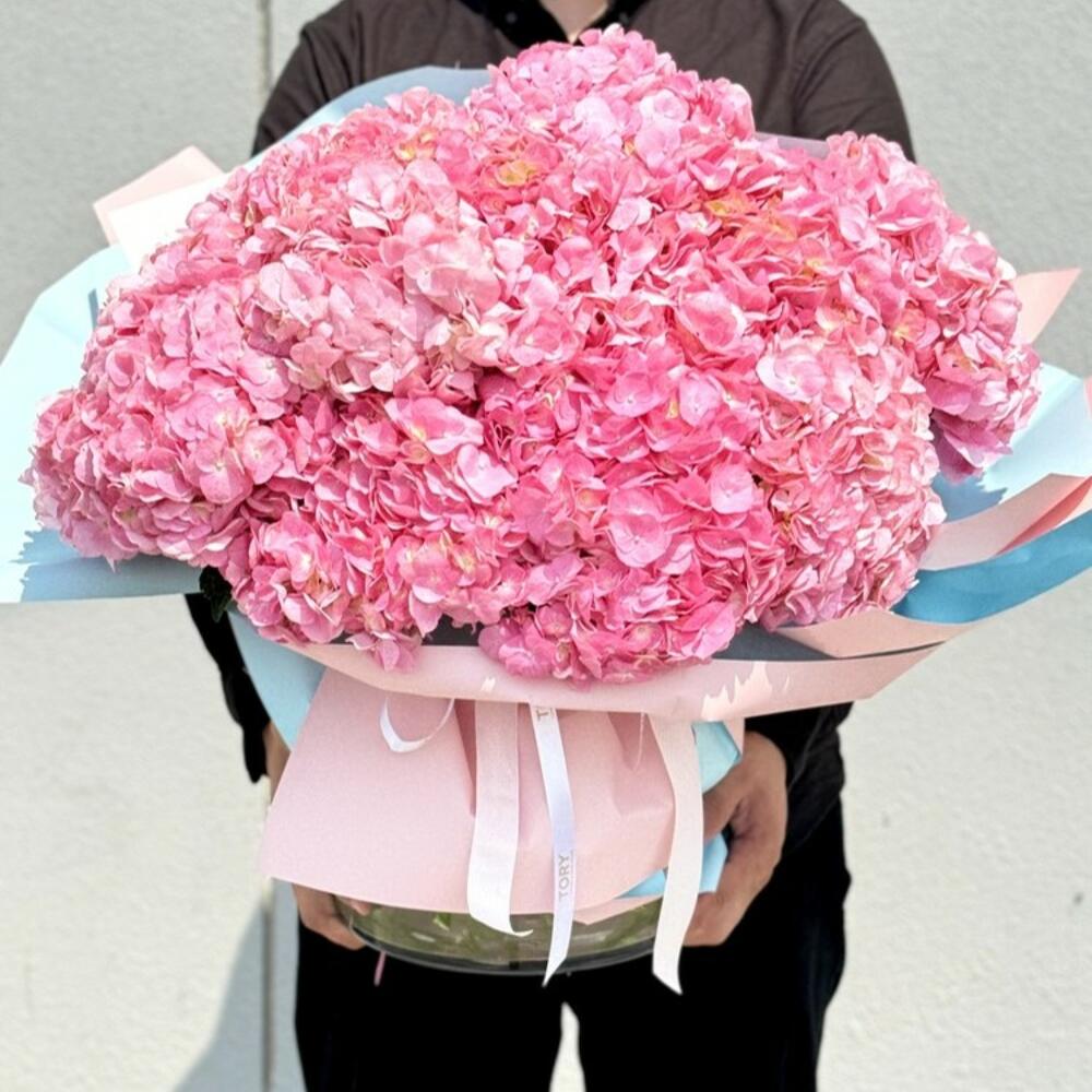 Composition: hydrangeas - 15, ribbon - 1 Sizes: WIDTH - 65CM; HEIGHT - 50CM; LENGTH - 50CM; (including packaging) Size: 65 x 50 x 50 cm