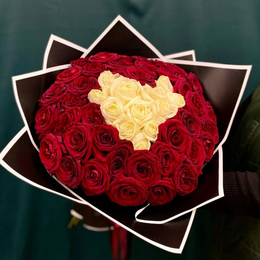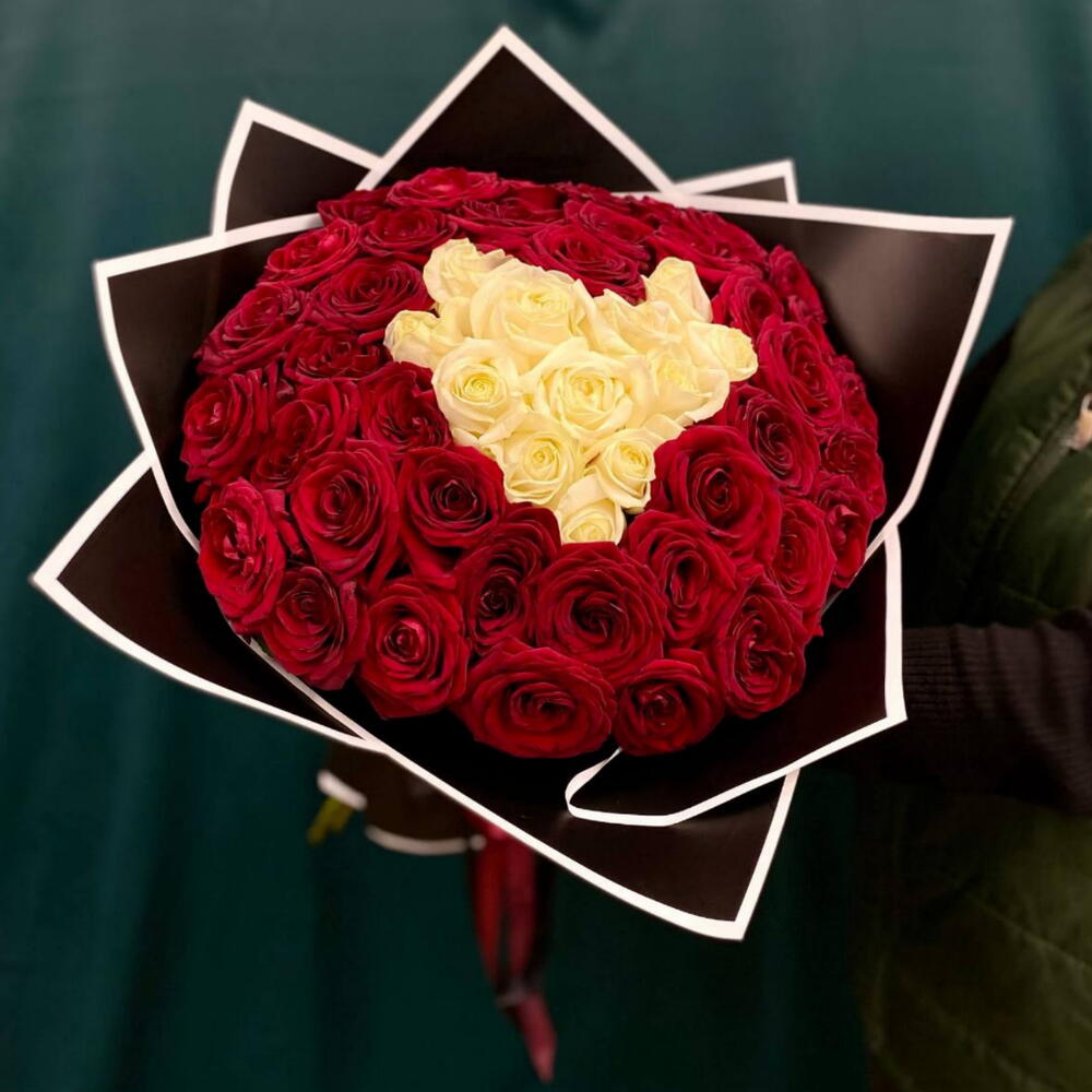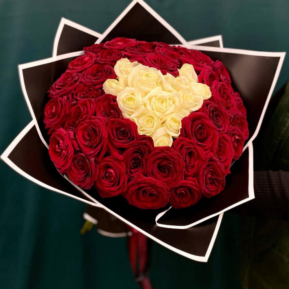 Ribbon - 2 pcs wrapping paper - 2 pcs card - 1 pcs krizal - 1 pcs instruction - 1 pcs red roses - 40 pcs white roses - 11 pcs