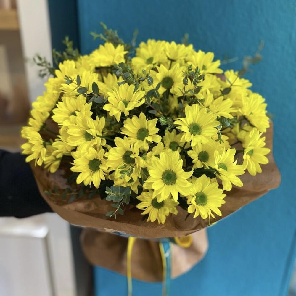Satin ribbon - 2 pcs Eucalyptus - 10 pcs wrapping paper - 1 pcs card - 1 pcs good feelings - 100 pcs krizal - 1 pcs instruction - 1 pcs yellow chrysanthemums - 51 pcs