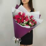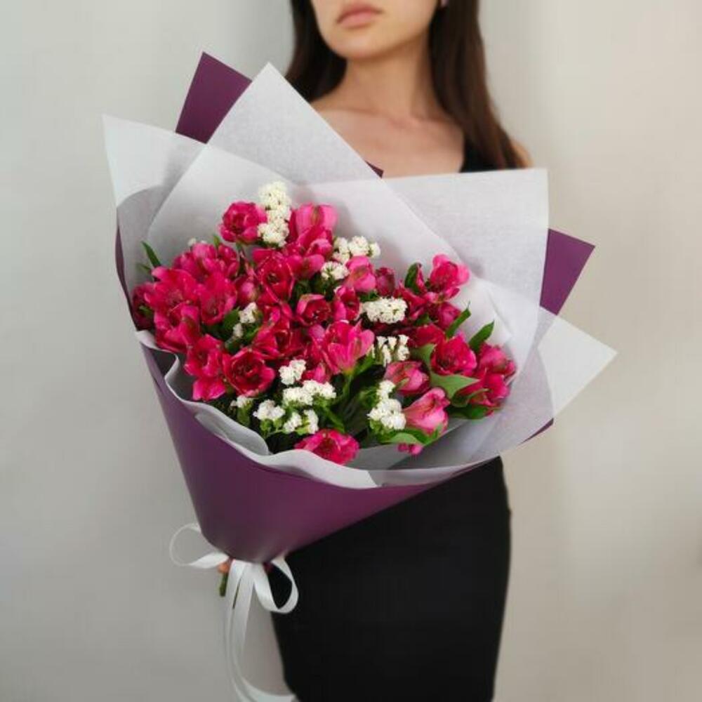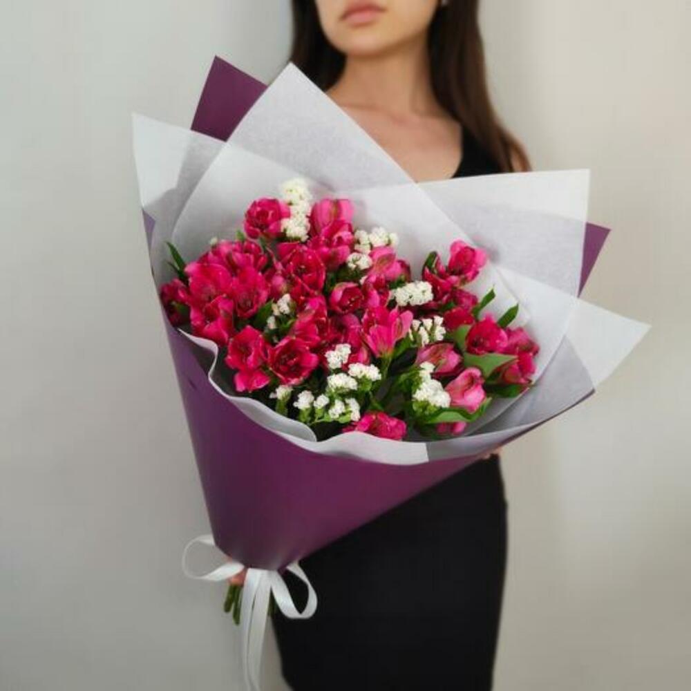Bouquet of pink alstroemerias and white statice. The bouquet measures approximately 36 cm wide and 50 cm high.