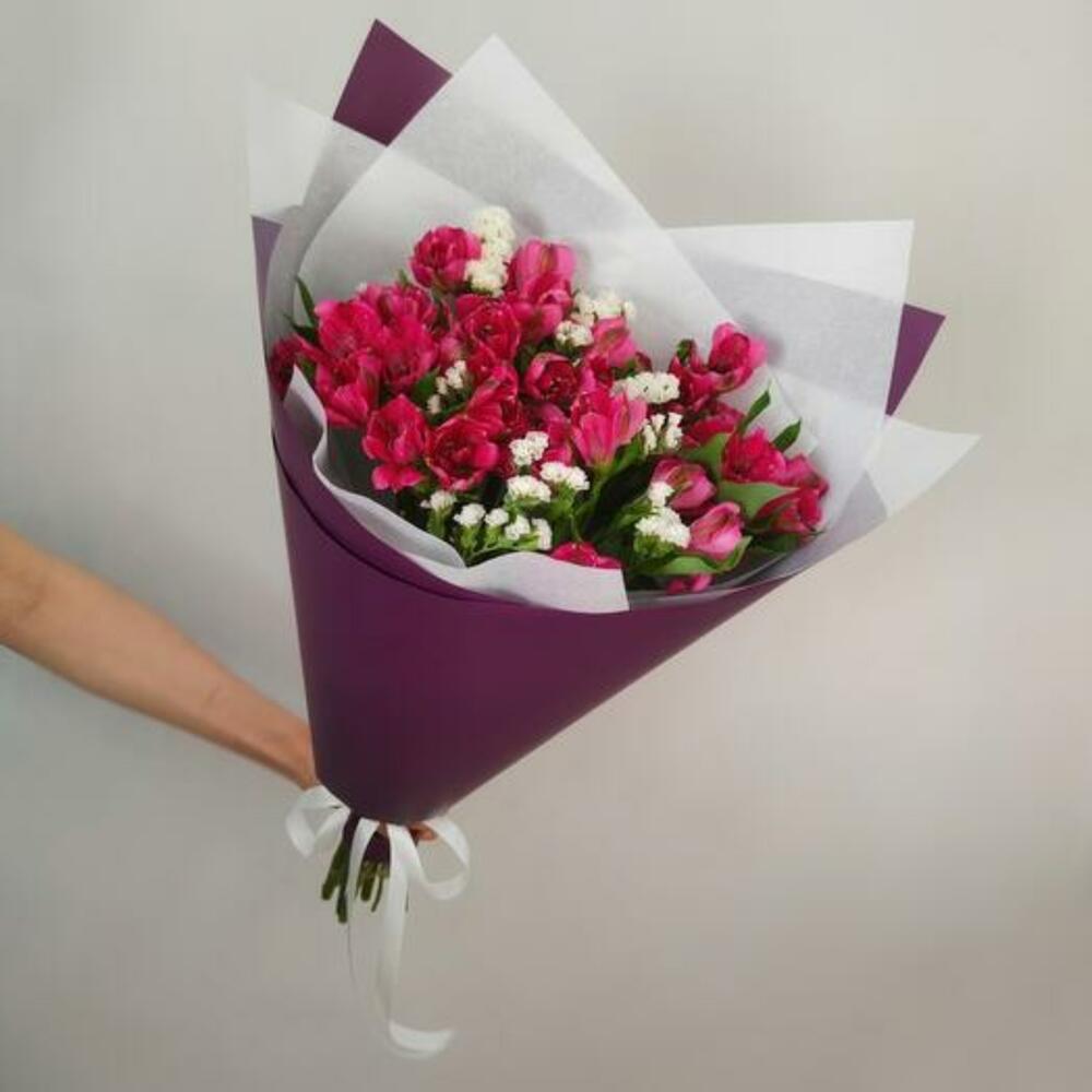 Statice - 2 pcs Ribbon - 1 pcs Alstroemeria - 7 pcs Pistachio - 1 pcs tissue - 3 pcs matte foil - 2 pcs
