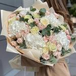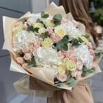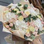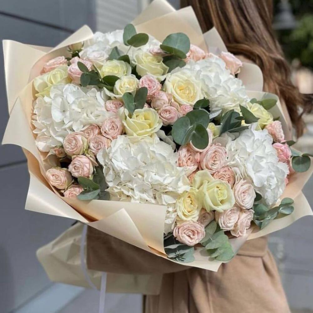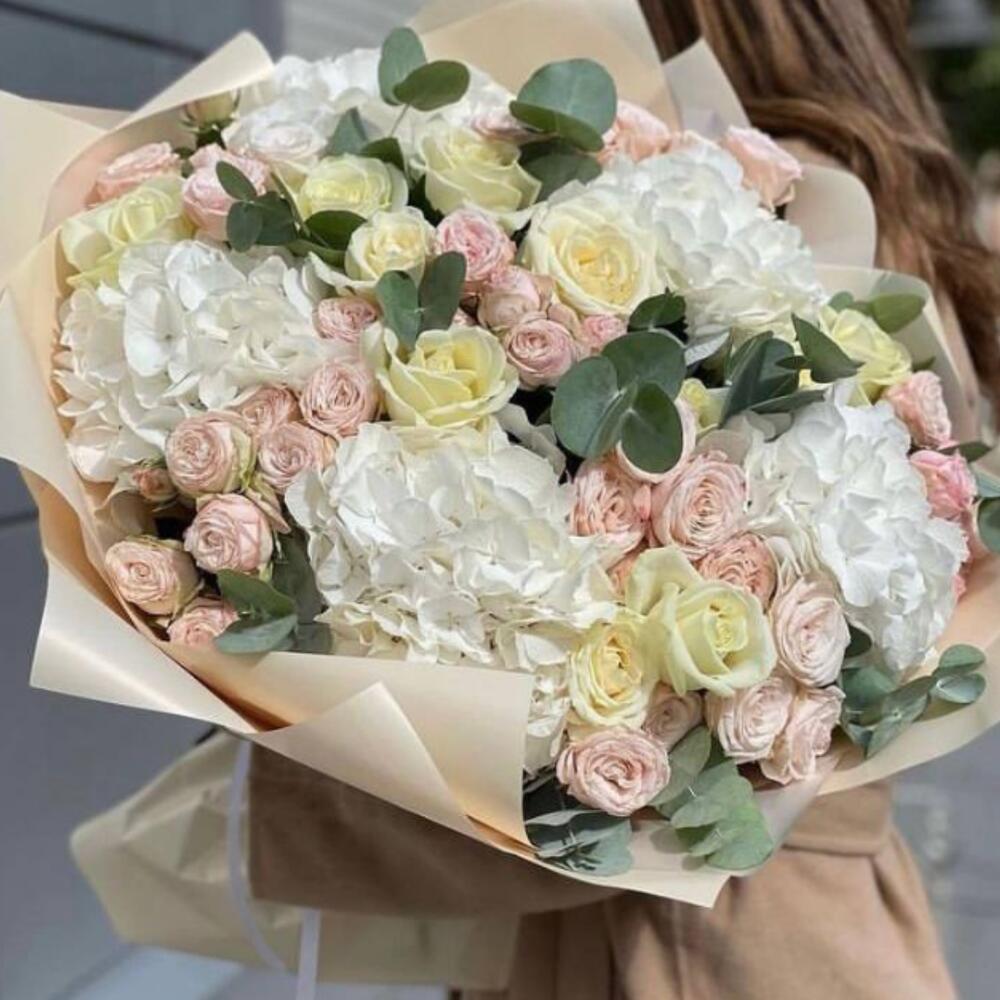 Bouquet of assorted hydrangeas, roses and eucalyptus
