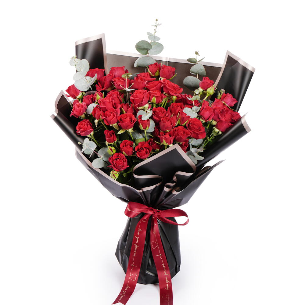 black paper - 3 pcs red baby roses - 10 pcs cinerea - 1 pcs