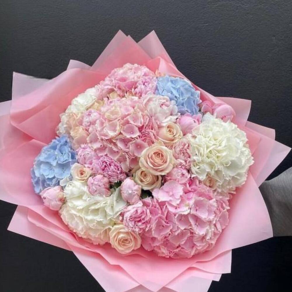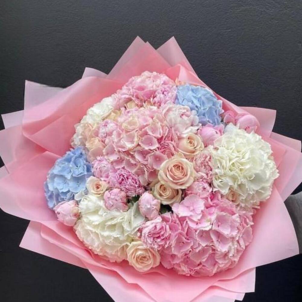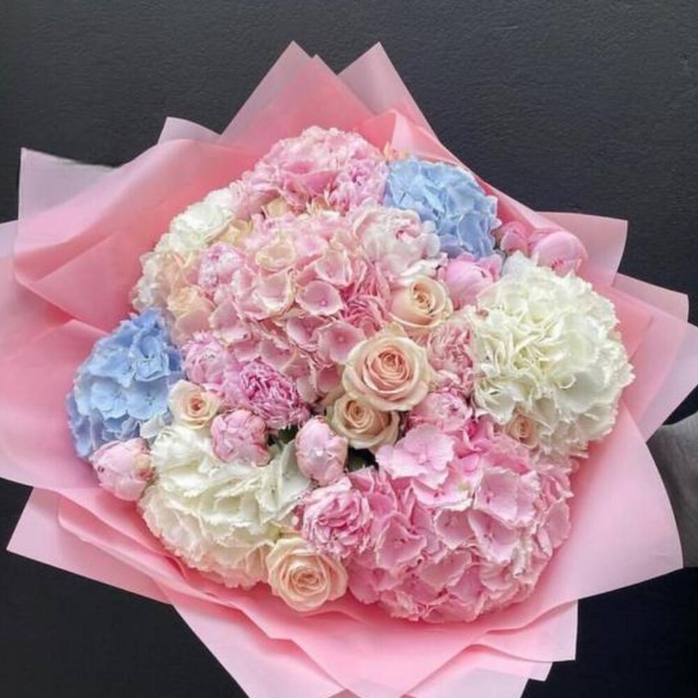 Bouquet of beige roses,pink peonies, assorted hydrangeas