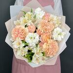 Satin ribbon - 1 pcs Alstroemeria - 4 pcs dianthus - 3 pcs mattiola - 3 pcs design packaging - 6 pcs peony bush rose - 1 pcs