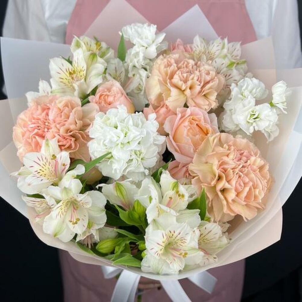 Satin ribbon - 1 pcs Alstroemeria - 4 pcs dianthus - 3 pcs mattiola - 3 pcs design packaging - 6 pcs peony bush rose - 1 pcs