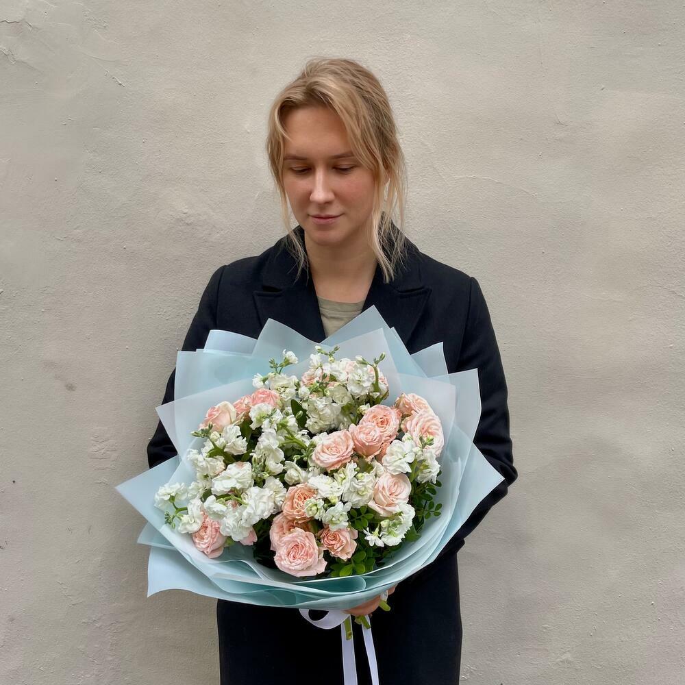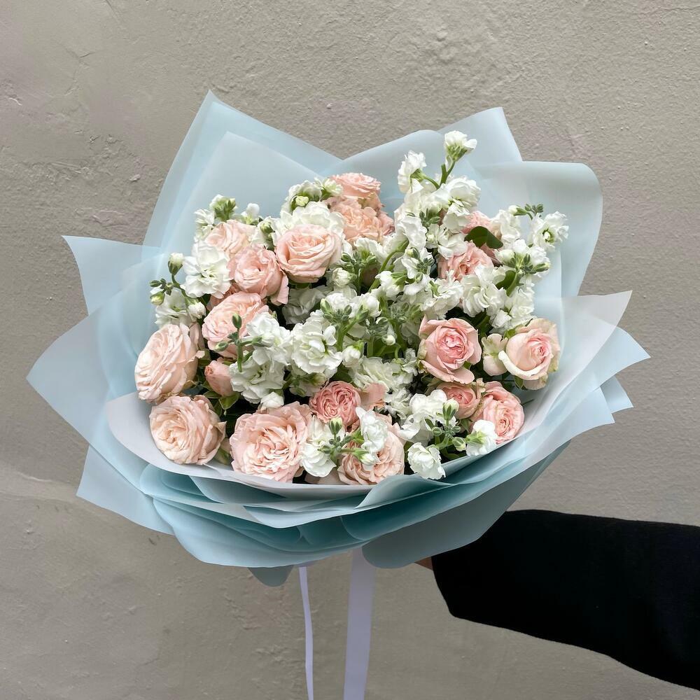 white spray matthiola - 10 pcs spray rose madam bombastic - 9 pcs wrapping paper blue - 5 pcs