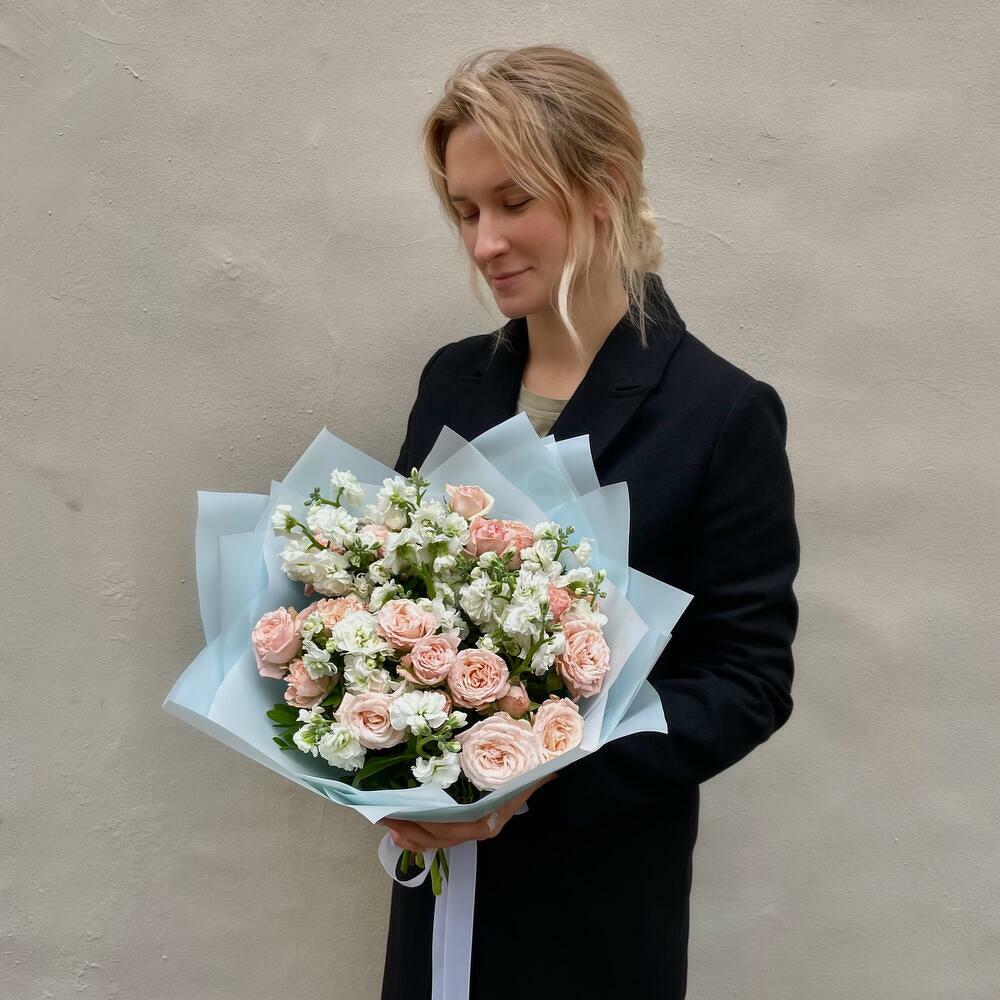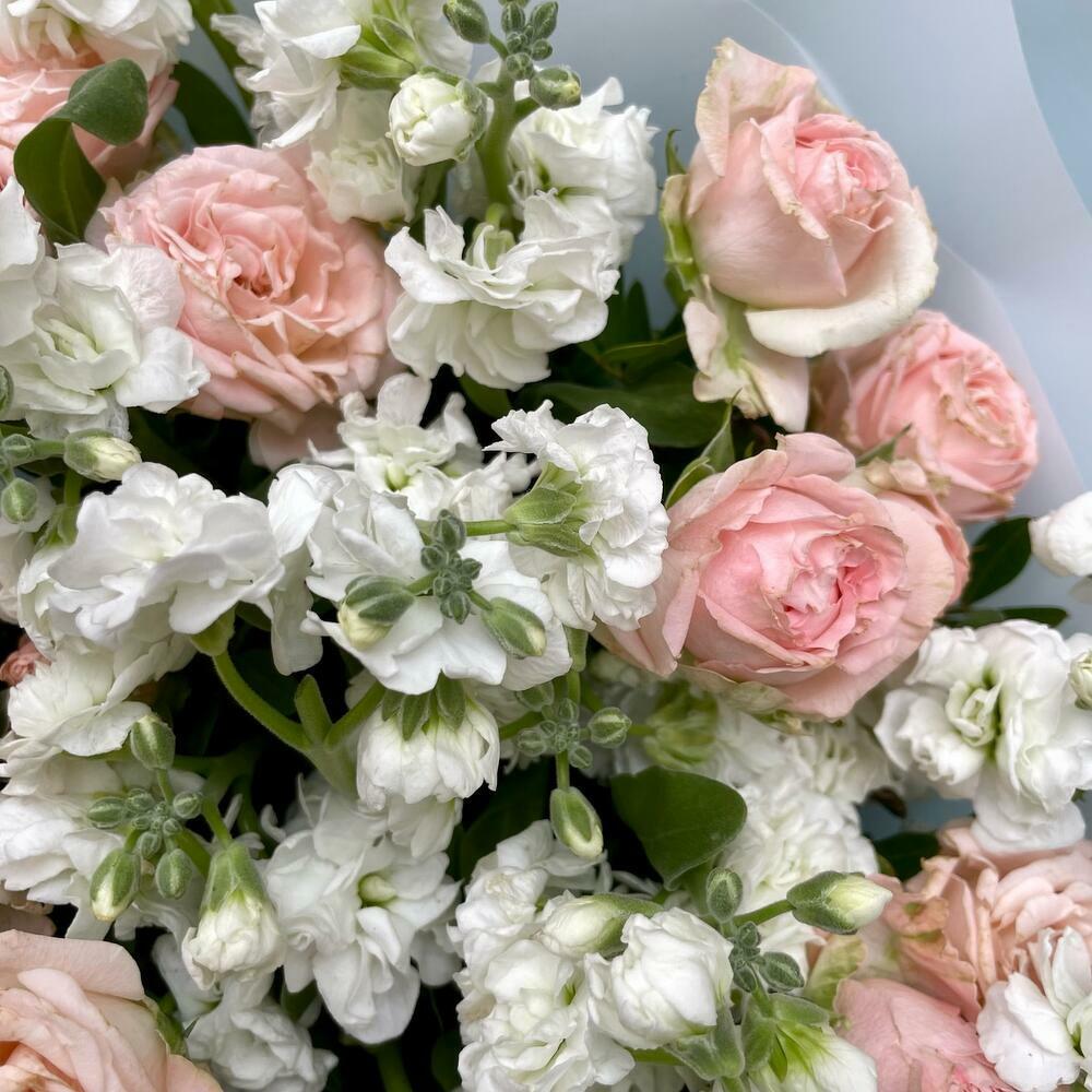 Bouquet of white mathiola and and pink spray rose