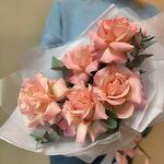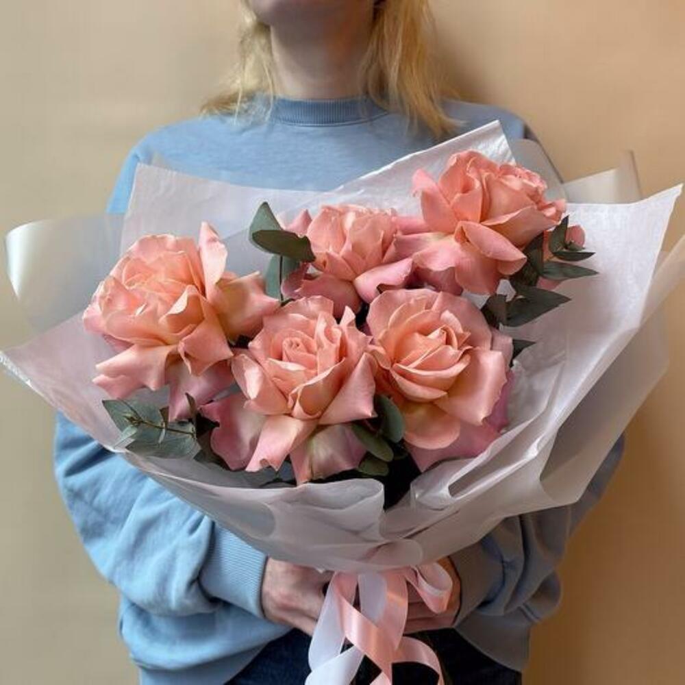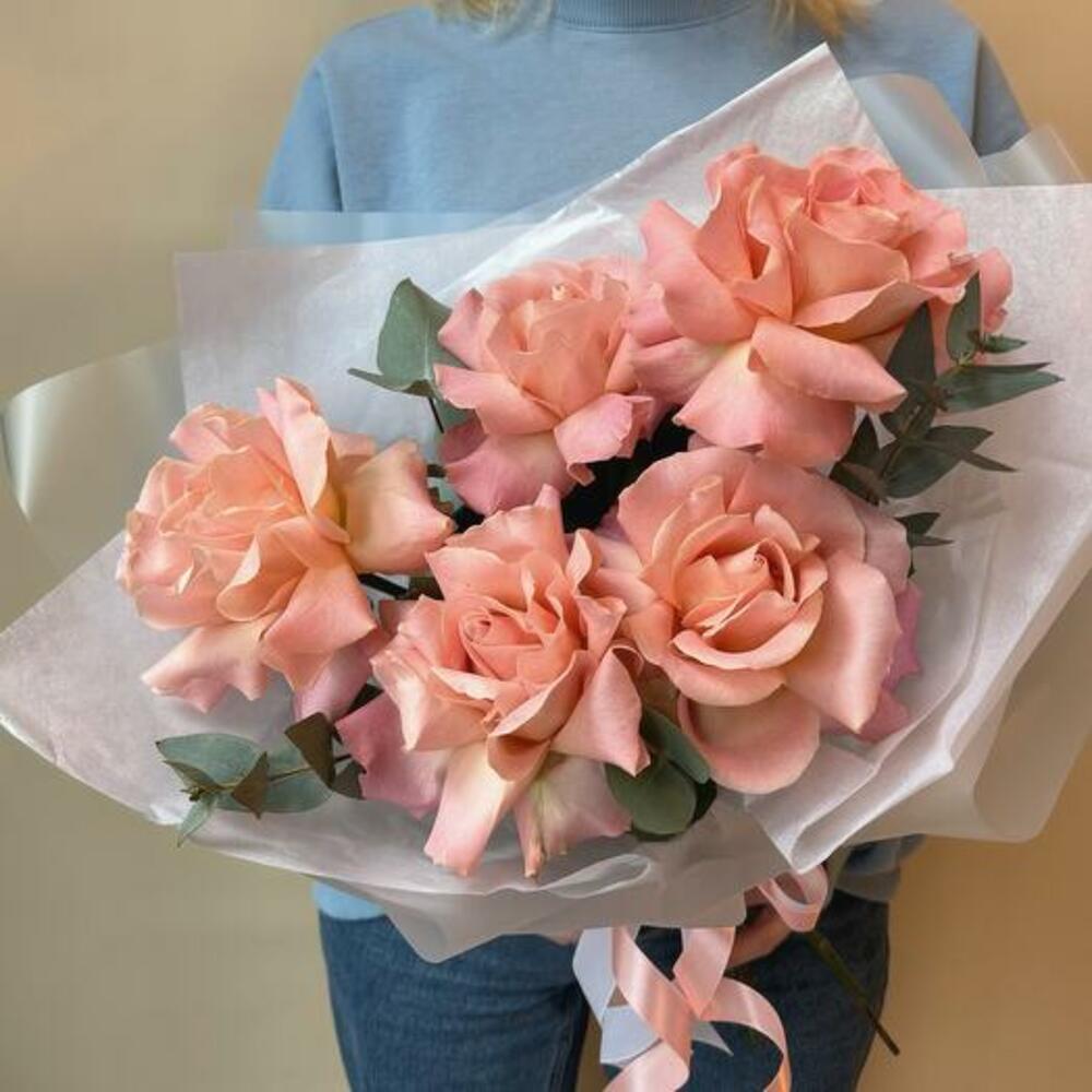 Delicate pink French roses combined with eucalyptus. Care tips: 1. Prepare the vase, pour cold, clean water into the vase and add 1/3 sachet of fertiliser, mix. 2. Cut the stems with a sharp knife or pruning shears at an angle of 45 degrees, 1-2 cm will be enough. 3. Put the flowers in water. Repeat the procedure every 2-3 days.