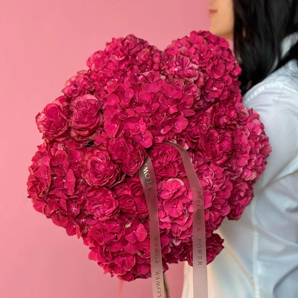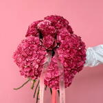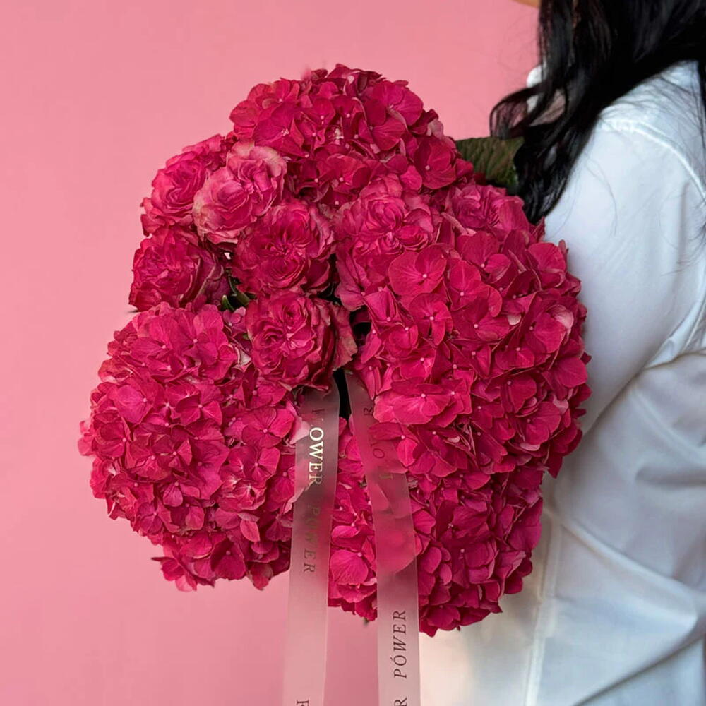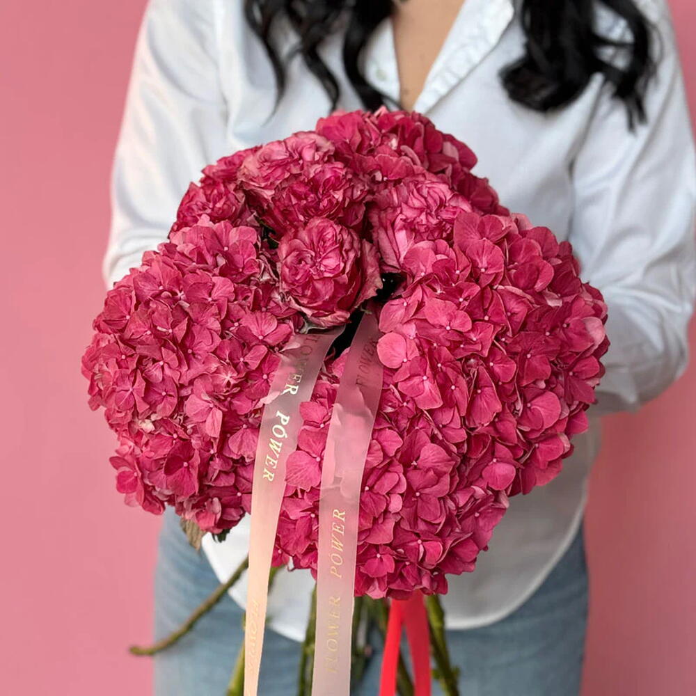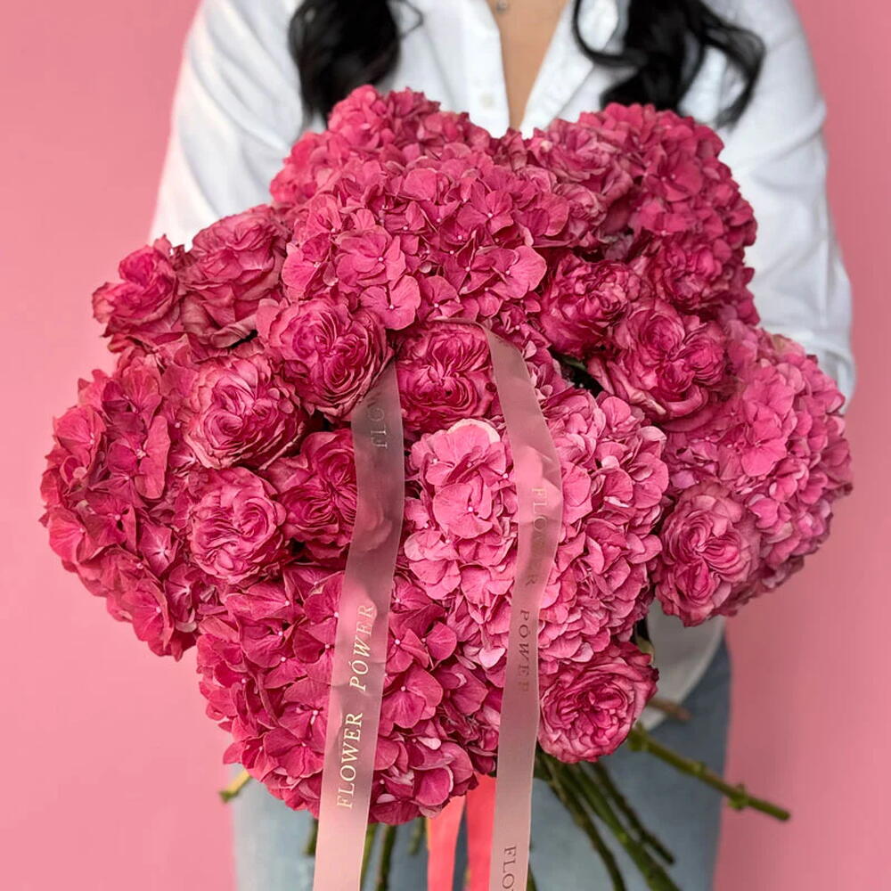 A bold and enchanting bouquet featuring an exquisite combination of vibrant fuchsia hydrangeas and premium garden roses. This lush, textural arrangement is a luxurious statement of joy, admiration, and passion—the perfect gift for romantic anniversaries, heartfelt congratulations, or simply to brighten someones day.