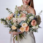 Eustoma - 3 pcs Eucalyptus - 1 pcs rose garden - 12 pcs hydrangeas - 2 pcs dianthus - 10 pcs mathiola - 3 pcs oxepetalum - 5 pcs