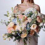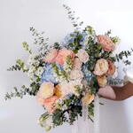 A beautiful, whimsical blend of apricot garden roses, white lisianthus, and striking blue delphiniums, complemented by lush eucalyptus. This Rustic Elegance arrangement showcases contrasting textures and soft, natural tones—a perfect thoughtful gift or captivating wedding centerpiece that embodies natural grace.