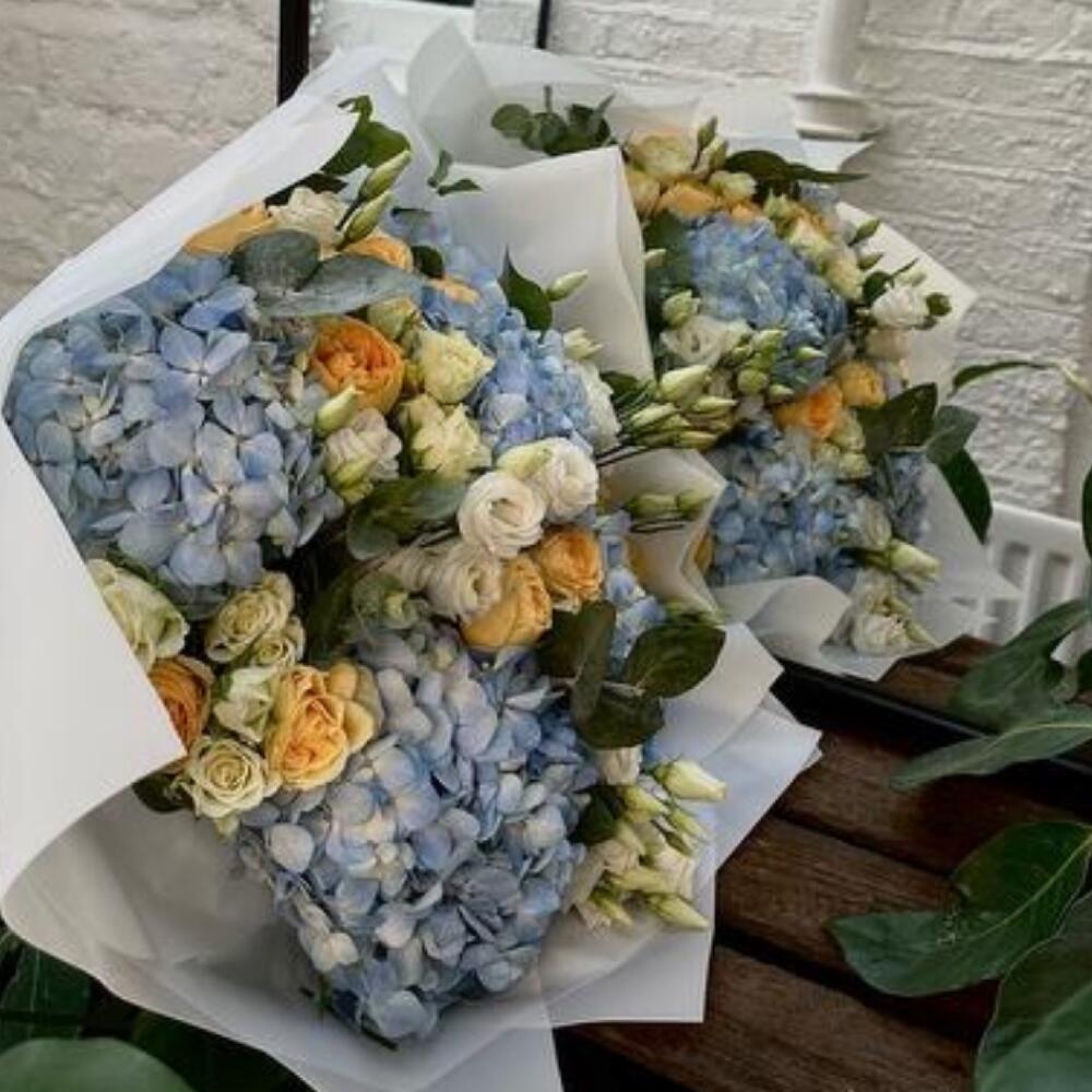 Yellow rose - 10 pcs white spray rose - 3 pcs blue hydrangea - 5 pcs white lisianthus stems - 3 pcs