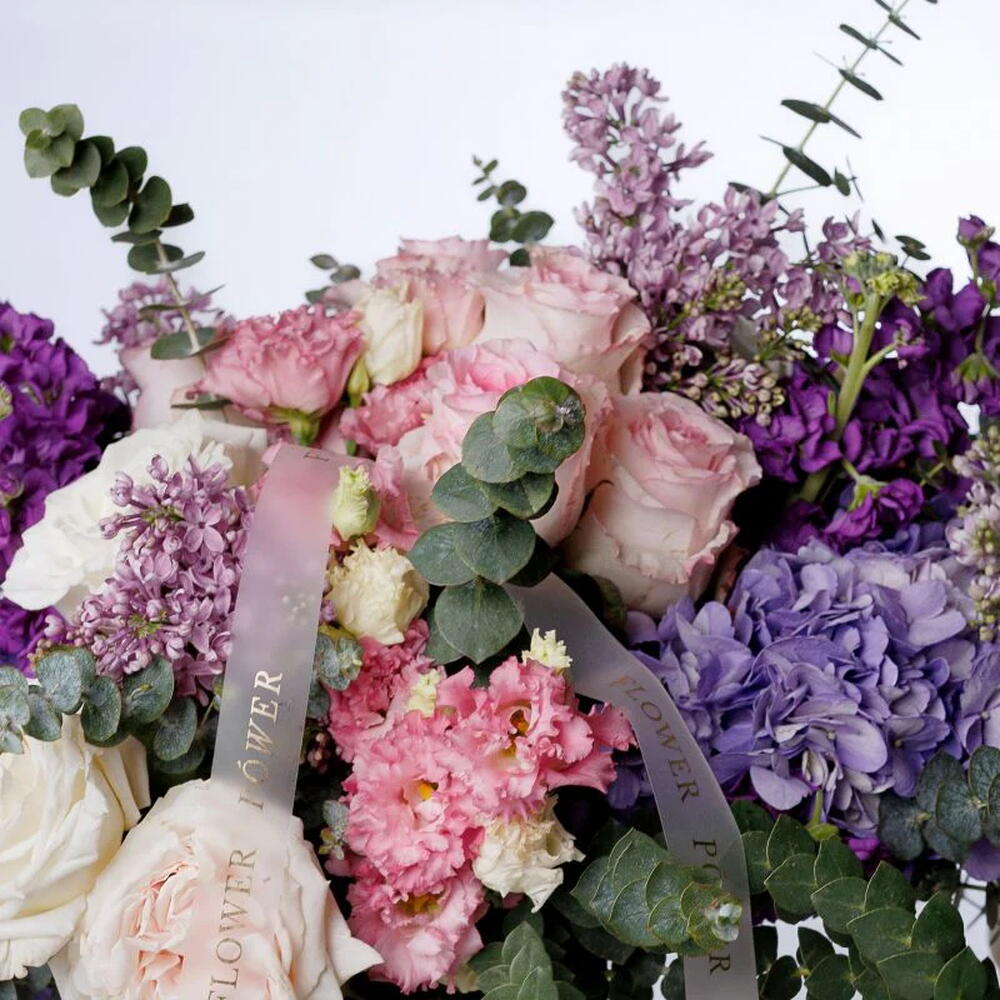 A lush and sophisticated bouquet featuring Matthiolas, Roses, Hydrangeas, and Eustomas, accented with fragrant Eucalyptus and exotic Midnight Rose Syringa. This captivating, textural arrangement makes an elegant and memorable gift for any special occasion.