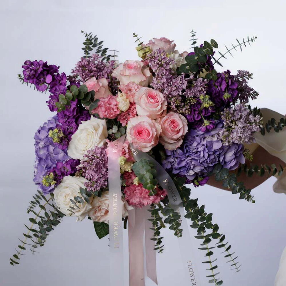 Eustoma - 5 pcs Eucalyptus - 2 pcs rose - 50 pcs hydrangeas - 5 pcs mathiola - 5 pcs syringa - 7 pcs
