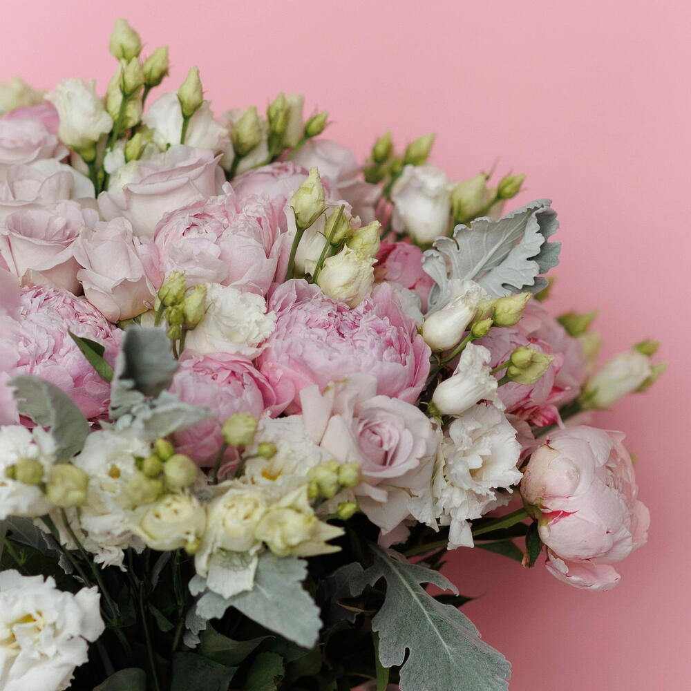 Eustoma white - 40 pcs Peony pink - 20 pcs rose pink - 40 pcs sinecio - 2 pcs