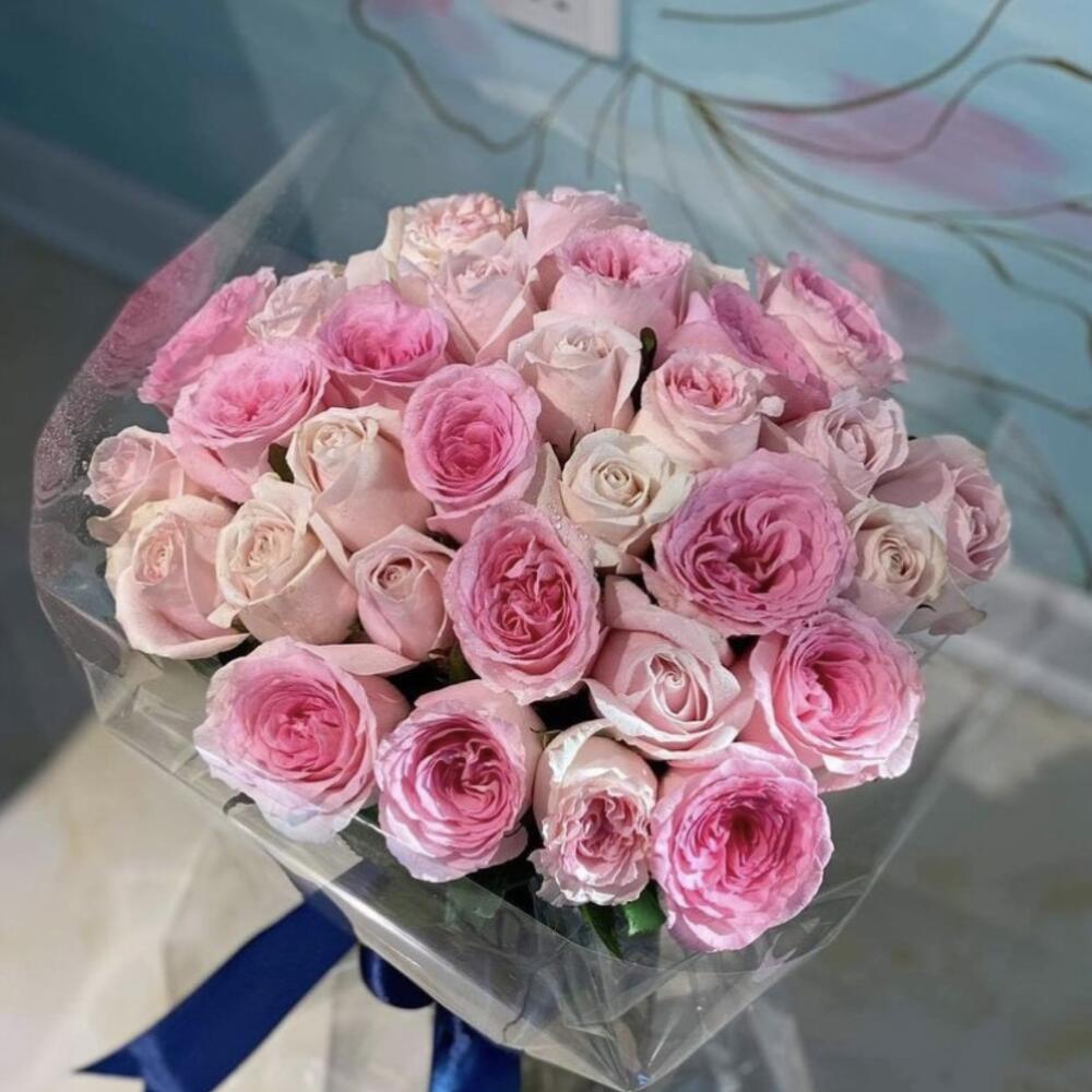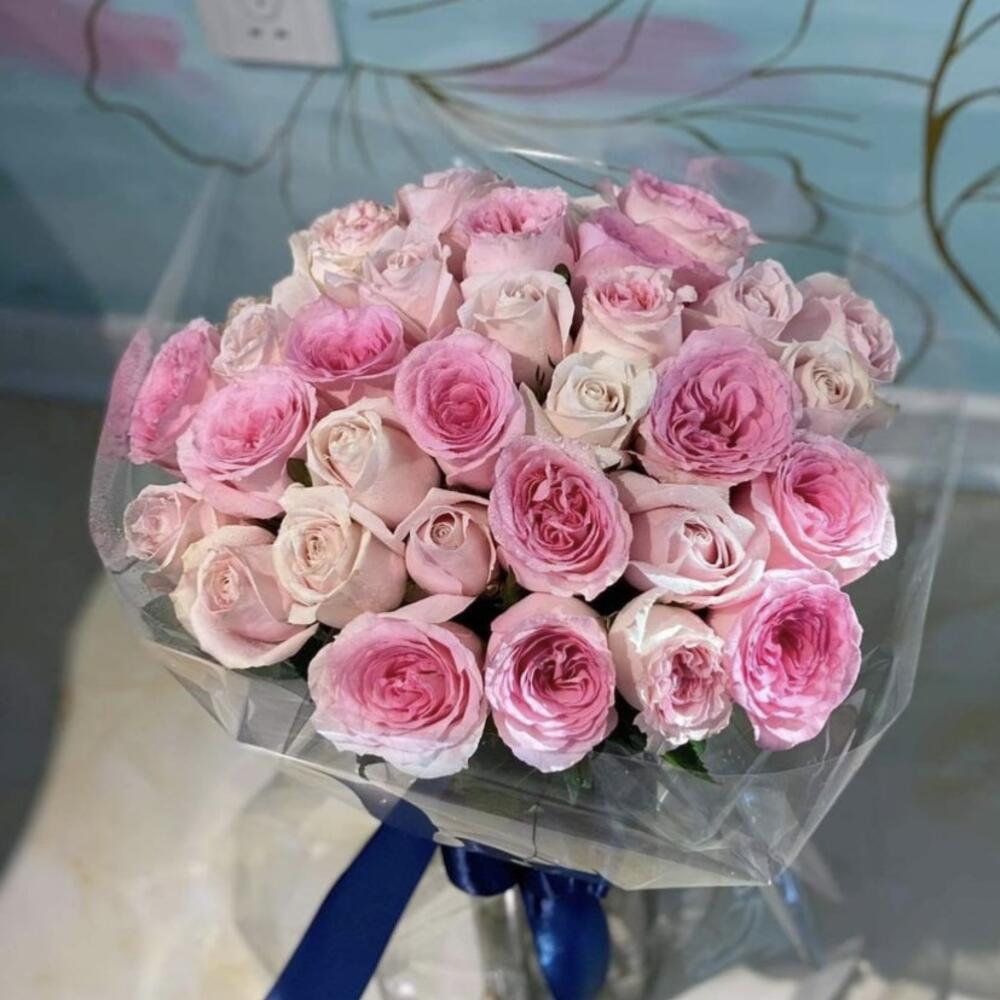 Satin ribbon - 2 pcs wrapping paper - 1 pcs card - 1 pcs good feelings - 100 pcs krizal - 1 pcs instruction - 1 pcs pink roses - 18 pcs peony roses - 13 pcs