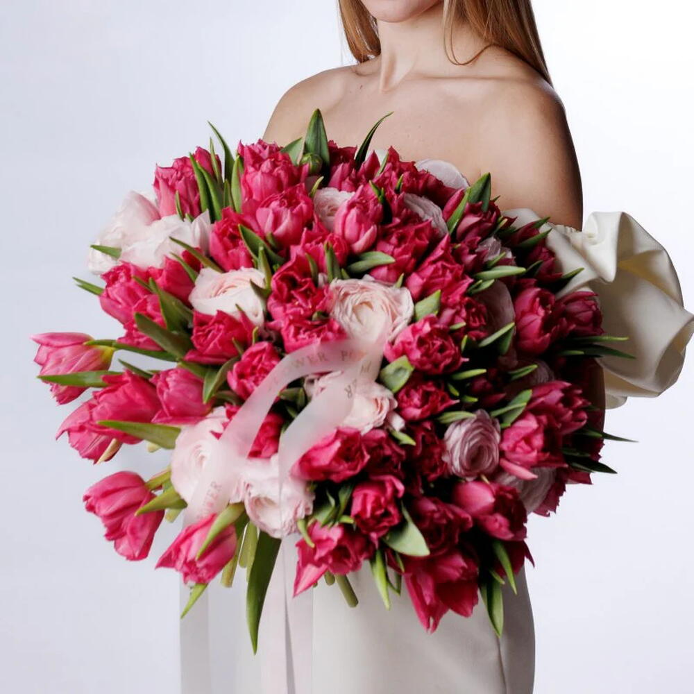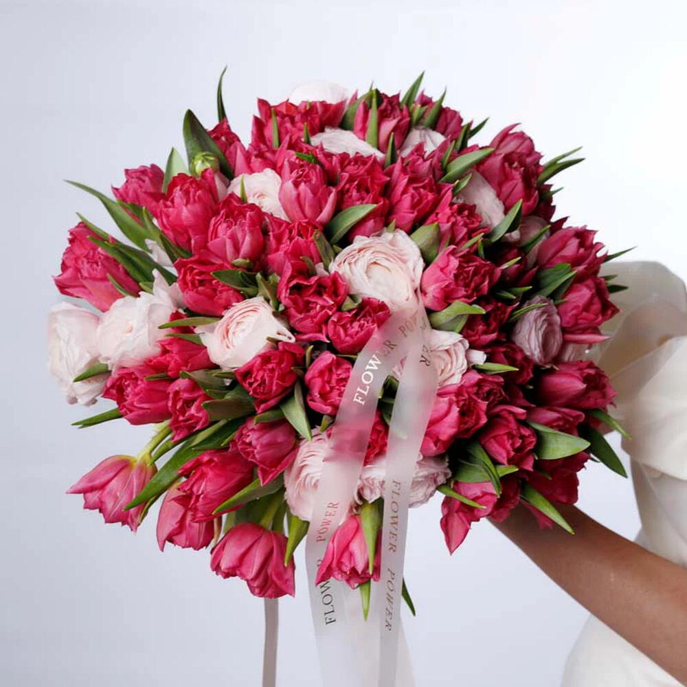 A vibrant and elegant bouquet featuring a stunning blend of deep pink tulips and soft blush ranunculus. This masterpiece of color and texture conveys heartfelt admiration, joy, and lasting elegance—a perfect gift for birthdays, anniversaries, or to celebrate lifes vibrant moments.