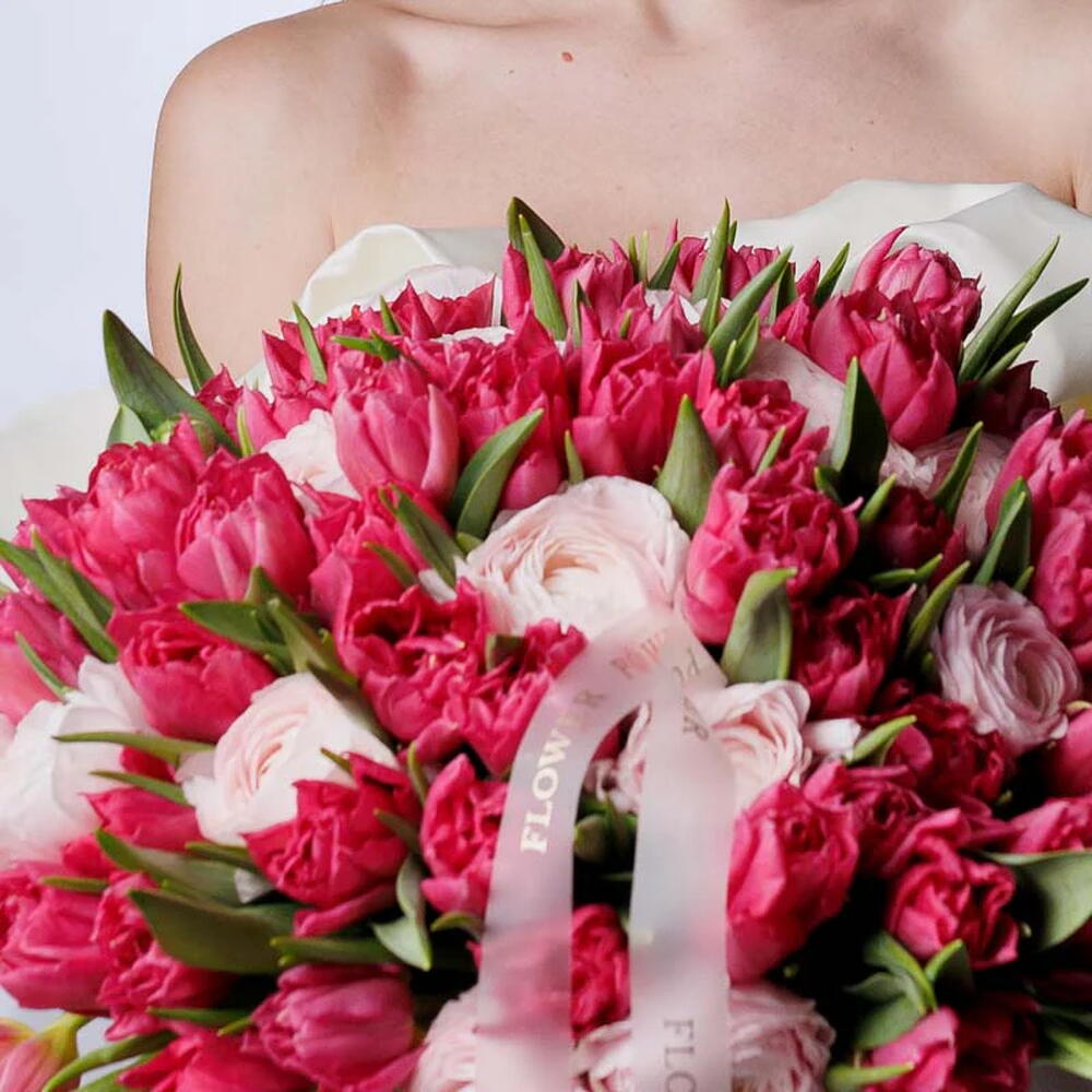 Pink Obsession: Large Bouquet of 50 Pink Tulips and 05 Blush Pink Ranunculus