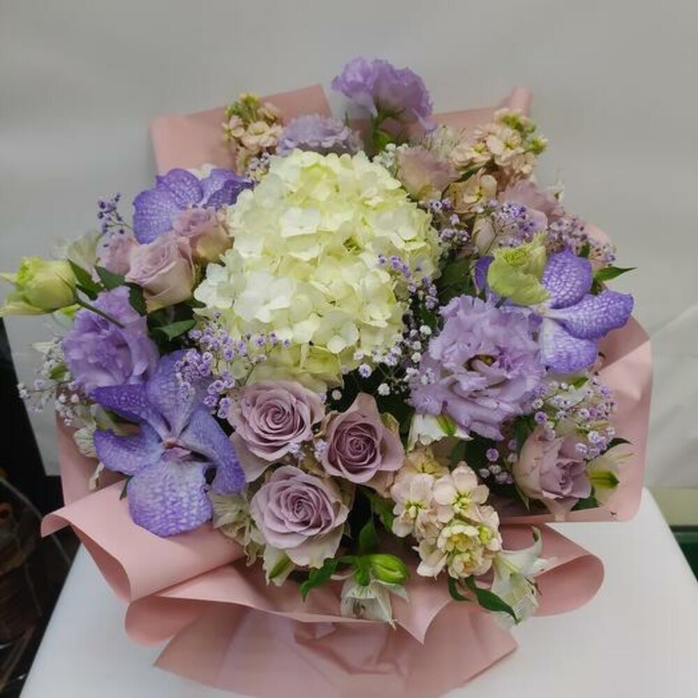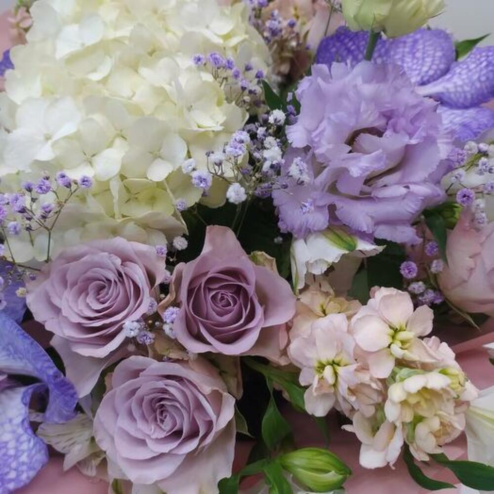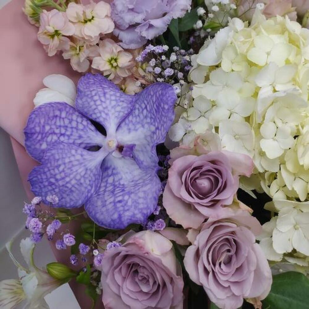 Hydrangea - 1 pcs Alstroemeria - 8 pcs Gypsophila - 3 pcs Lisianthus - 3 pcs packaging - 1 pcs matthiola - 3 pcs wanda - 3 pcs rose (kenya) - 10 pcs