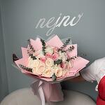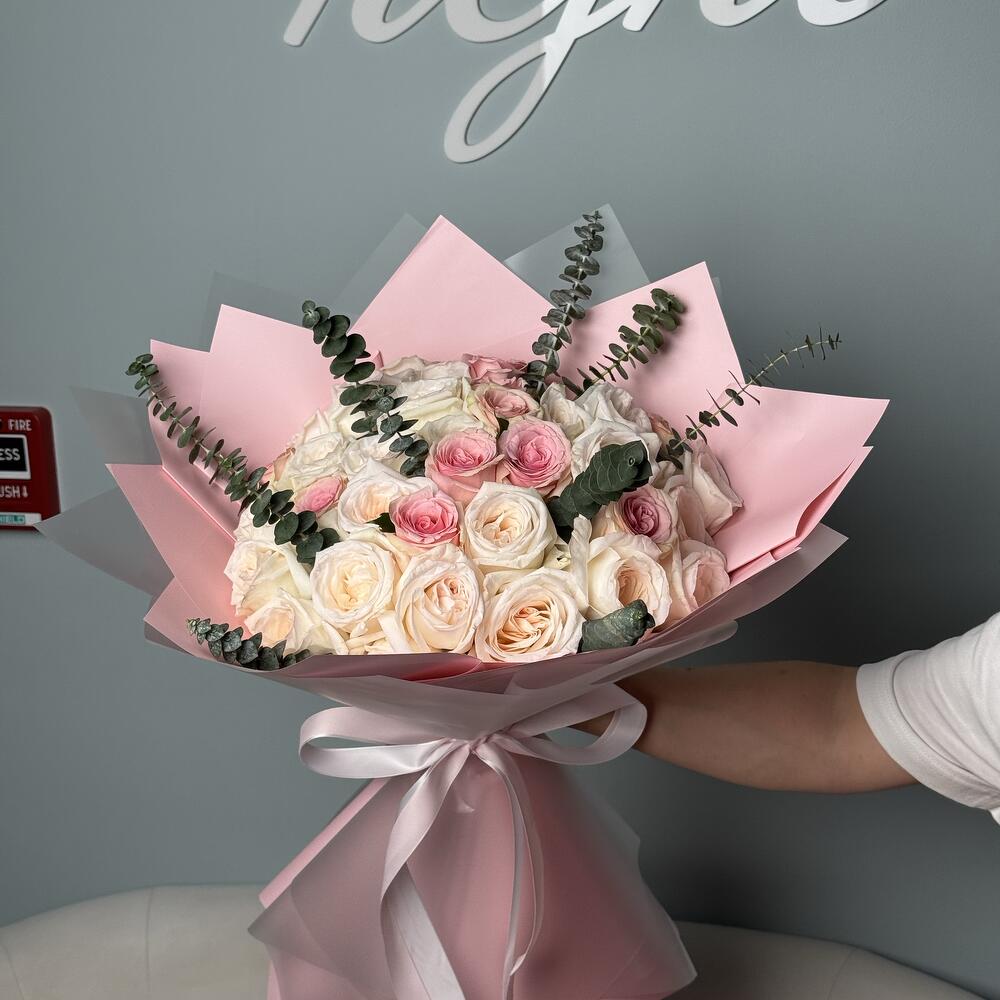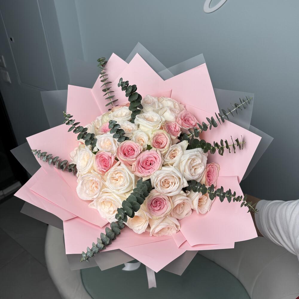 Eucalyptus - 10 pcs pink roses - 7 pcs white roses - 26 pcs