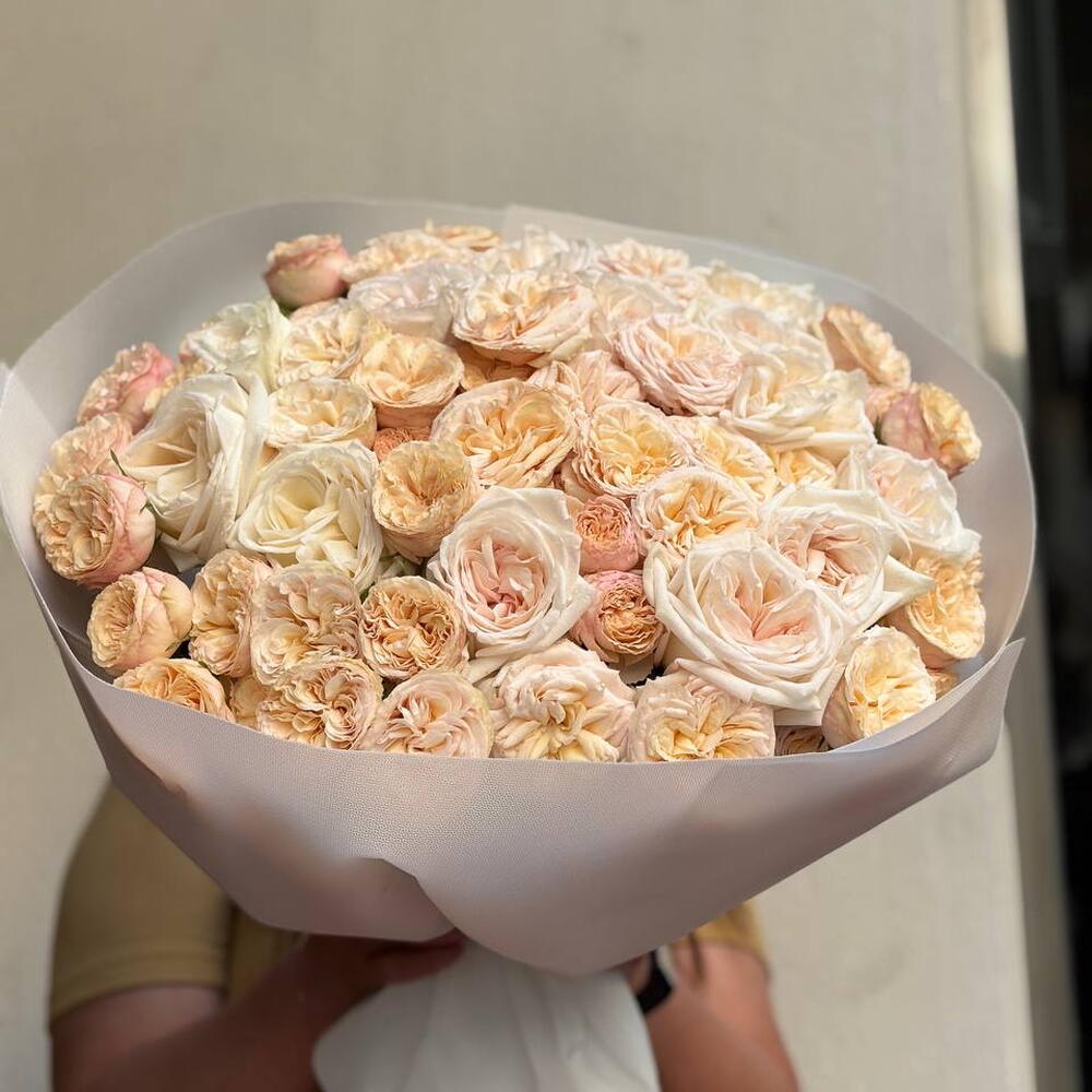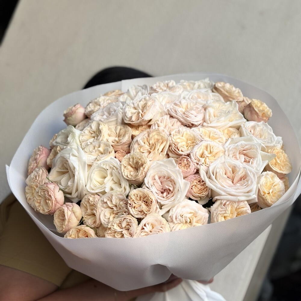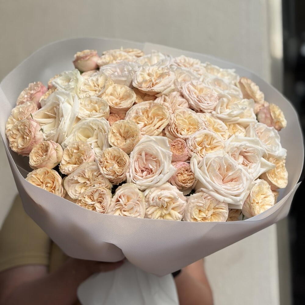 A magnificent duo of shades: the rich berry color of Ohara roses and the creamy tenderness of peony-shaped buds. The bouquet looks voluminous, noble and very refined, combining passion and soft elegance.