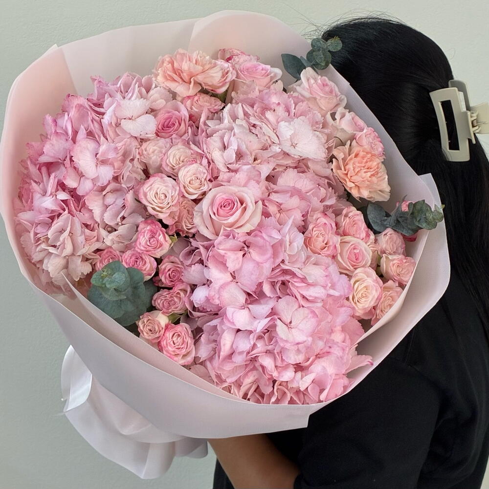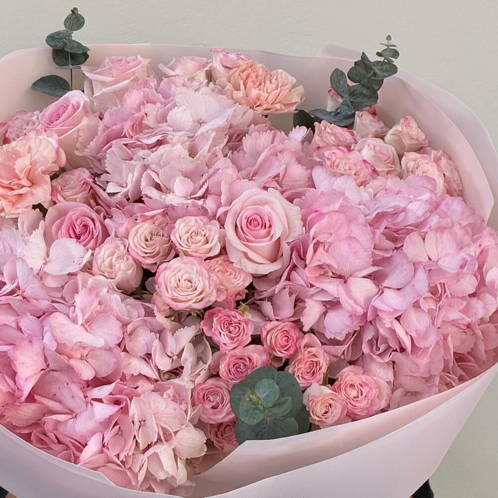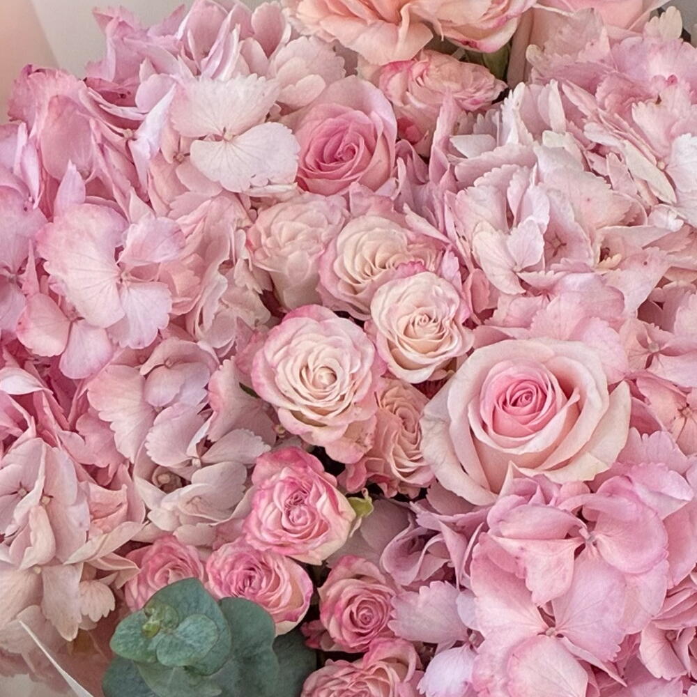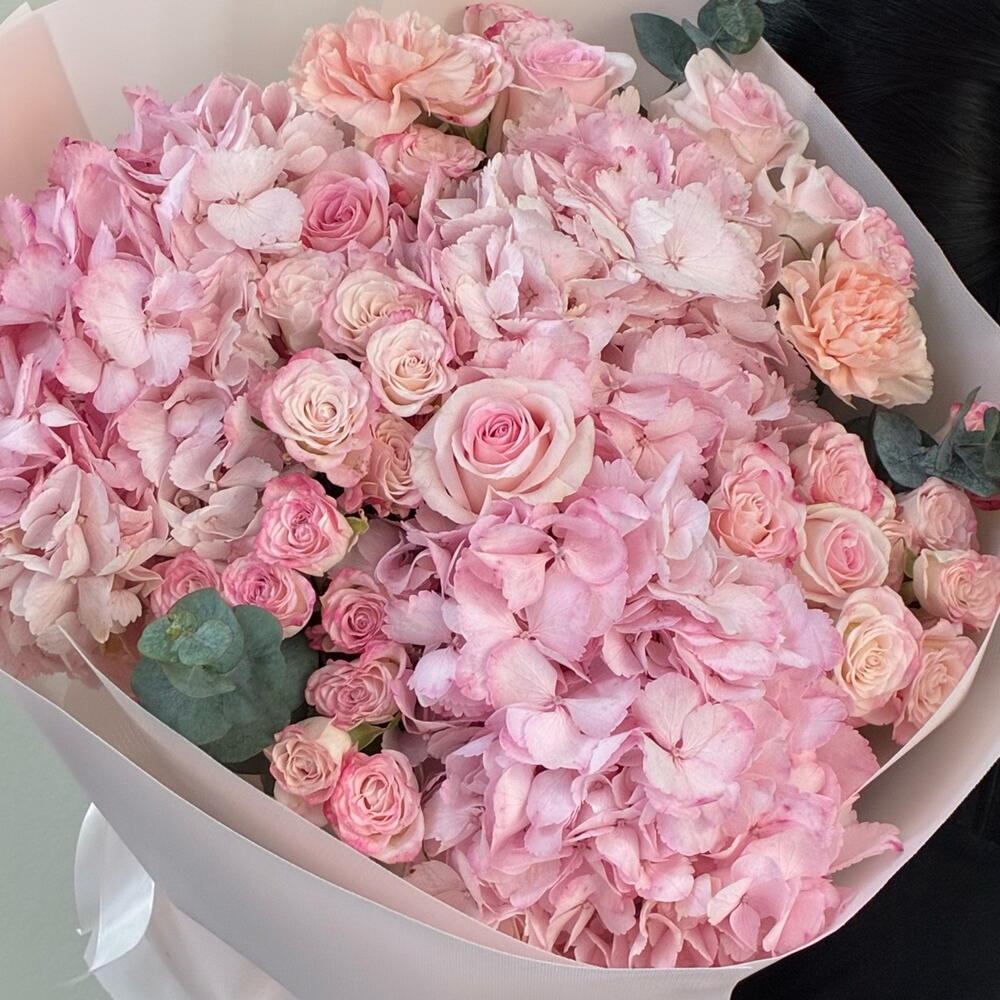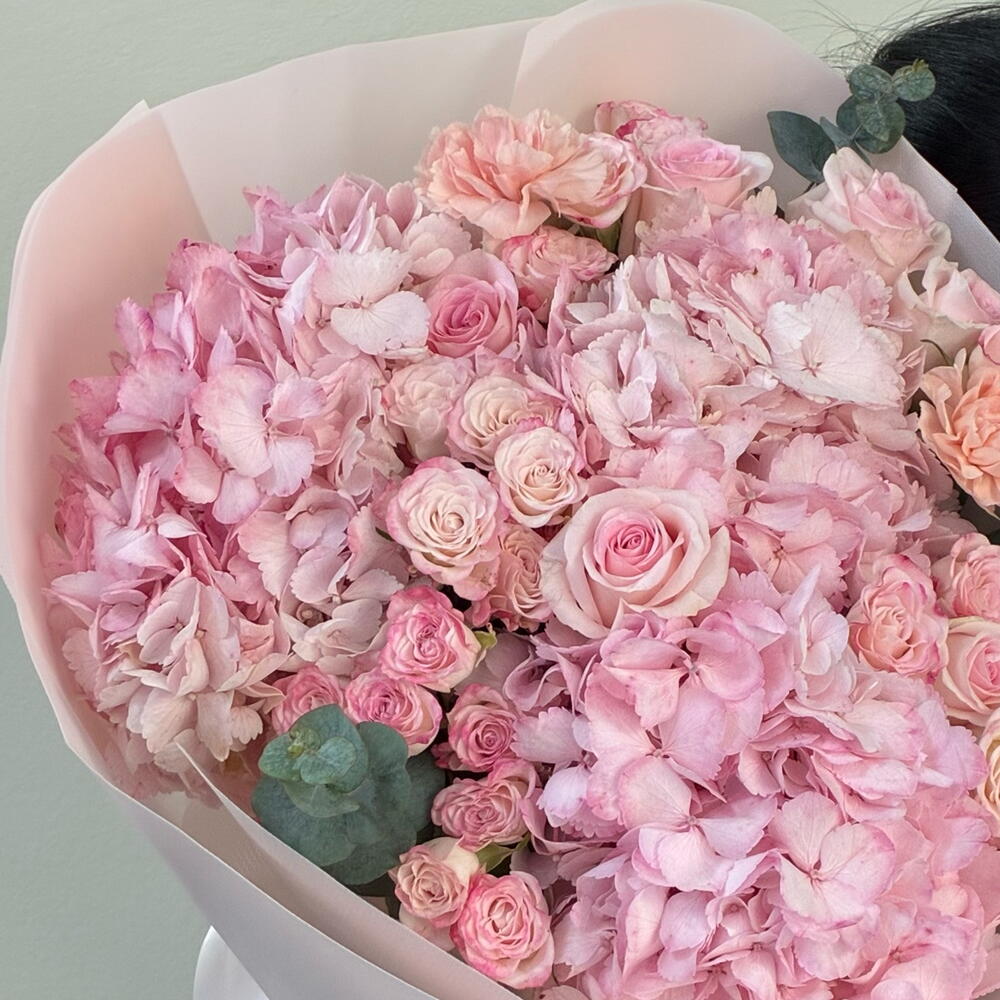 Amazing pink bouquet with hydrangeas , velvety and mysterious, framed by lush peony roses of delicate pastel tones. The luxurious contrast of textures and the exquisite harmony of shades give a feeling of magic and sophisticated elegance.