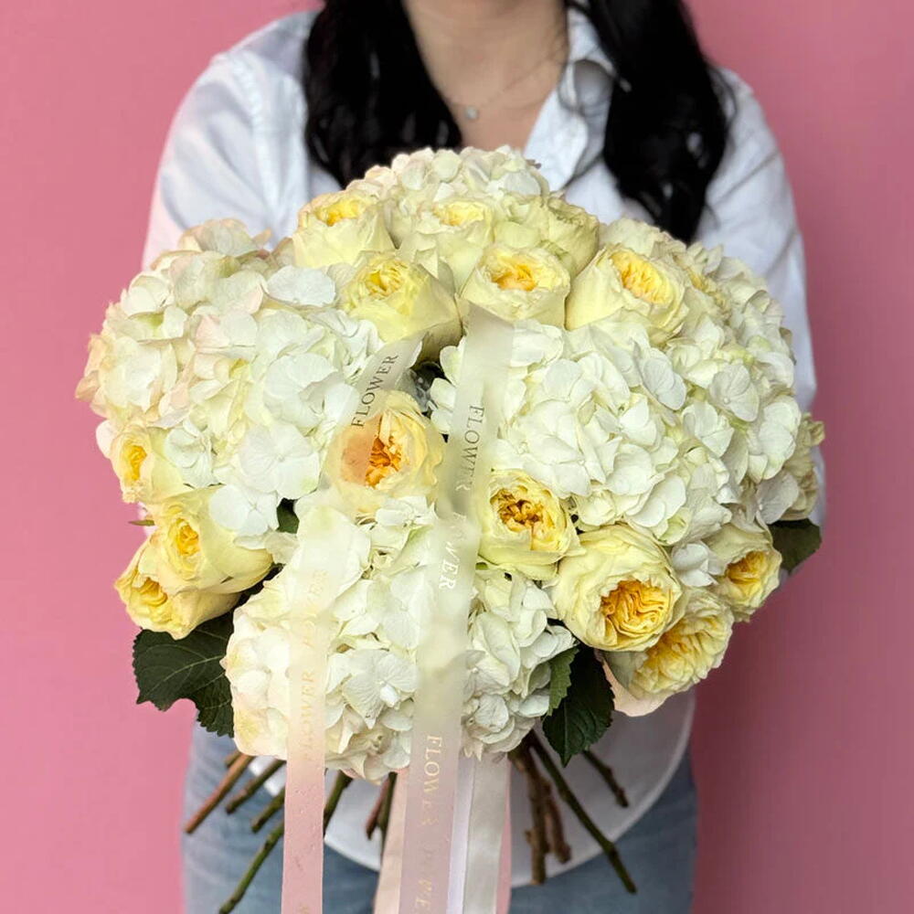 A classic and sophisticated blend of creamy yellow roses and pristine white hydrangeas, embodying timeless elegance and grace. This luxurious composition symbolizes sincere admiration and enduring affection—making it the ideal choice for weddings, anniversaries, or as a refined appreciation gift.