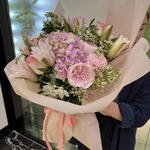 Composition: Alstroemeria - 1, Lily Double Oriental - 4, Chamelacium - 2, Hydrangea - 1, Jumilia rose - 10, Pistacia - 1, Rose David Austin - 3, Dianthus mix - 2, Flower Wrapping Paper - 1 Sizes: WIDTH - 55CM; HEIGHT - 65CM; LENGTH - 65CM; (including packaging) Size: 55 x 65 x 65 cm
